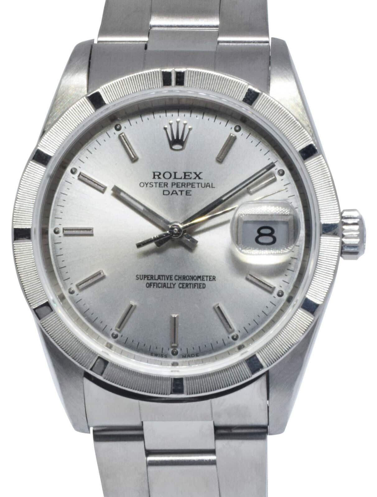 This Rolex Oyster Perpetual Date 15210 has a silver baton dial and a bracelet strap. This Rolex has undergone a thorough inspection of water resistance, accuracy, functionality and condition to determine the level of reconditioning required to meet our strict standards. It has also been referenced against technical documents and manufacturer records where available to ensure authenticity and a clean history. All our watches have a 24-month warranty for your peace of mind. One of our skilled polishing technicians has removed marks on the case and bracelet of this watch, brought about by daily wear and tear, which is why this watch does not come with the remaining manufacturer’s warranty.