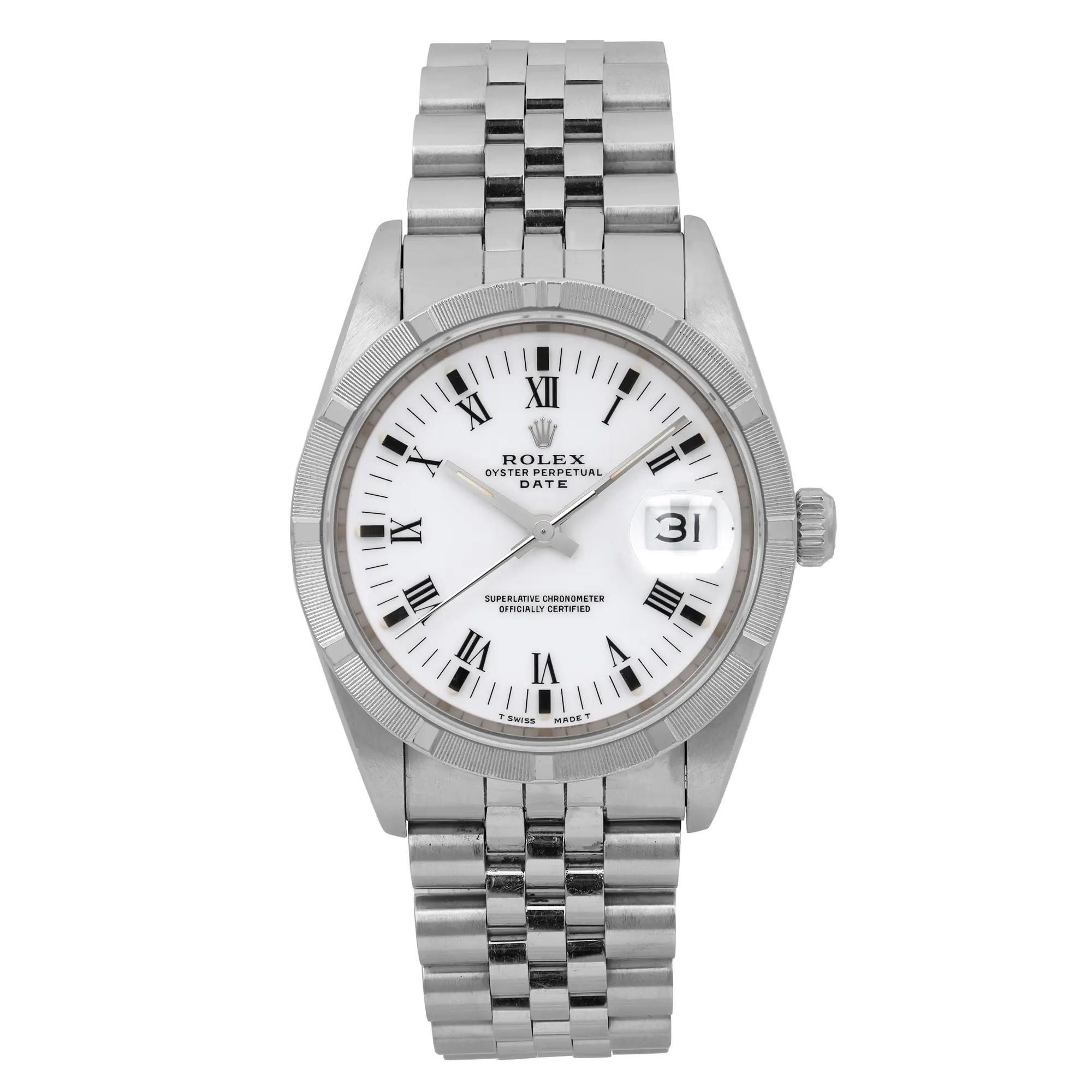 This Rolex Oyster Perpetual Date 15210 has a white roman numeral dial and a bracelet strap. This Rolex has undergone a thorough inspection of water resistance, accuracy, functionality and condition to determine the level of reconditioning required to meet our strict standards. It has also been referenced against technical documents and manufacturer records where available to ensure authenticity and a clean history. All our watches have a 24-month warranty for your peace of mind. One of our skilled polishing technicians has removed marks on the case and bracelet of this watch, brought about by daily wear and tear, which is why this watch does not come with the remaining manufacturer’s warranty.