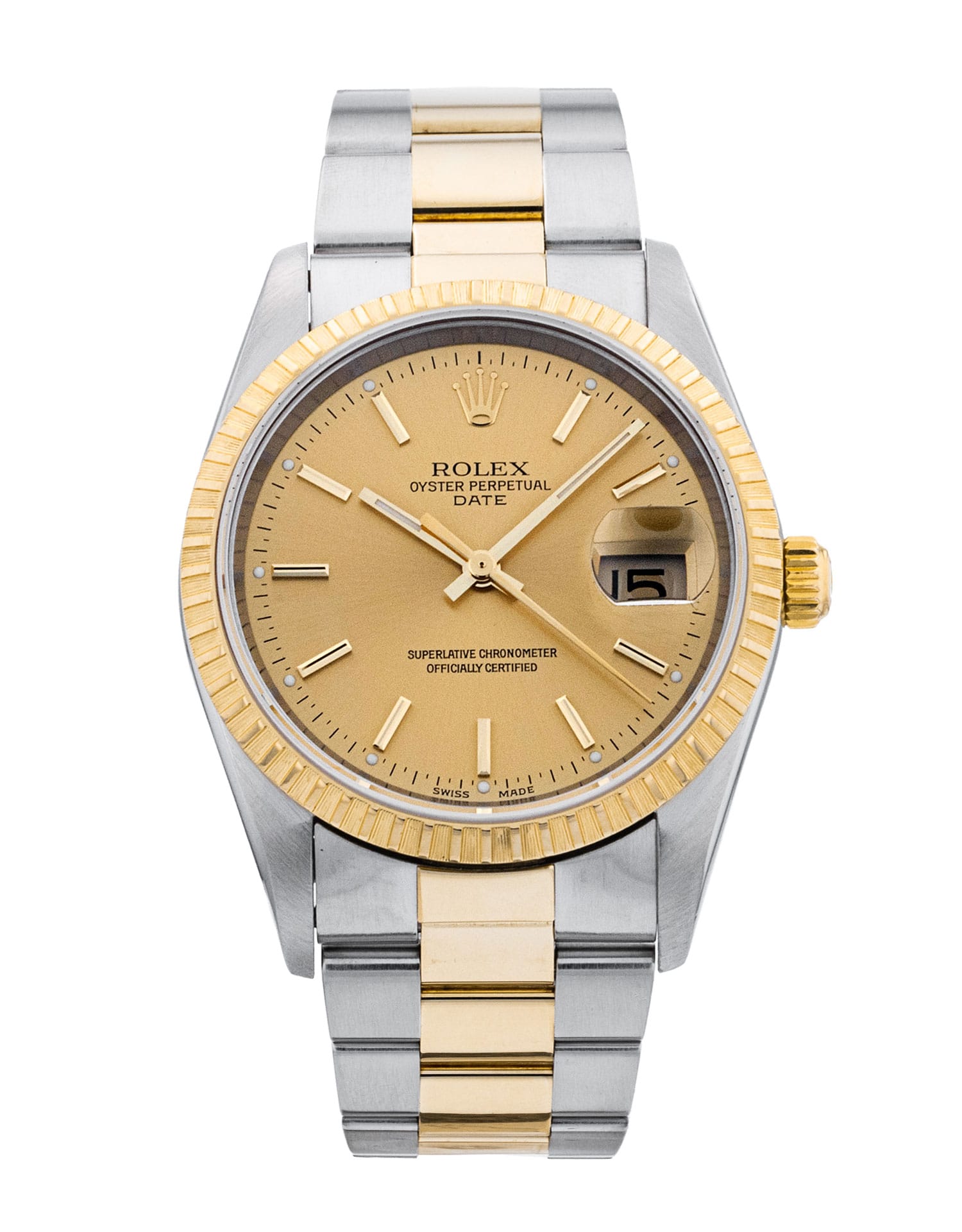 This Rolex Oyster Perpetual Date 15223 has a champagne baton dial and a bracelet strap. This Rolex has undergone a thorough inspection of water resistance, accuracy, functionality and condition to determine the level of reconditioning required to meet our strict standards. It has also been referenced against technical documents and manufacturer records where available to ensure authenticity and a clean history. All our watches have a 24-month warranty for your peace of mind. One of our skilled polishing technicians has removed marks on the case and bracelet of this watch, brought about by daily wear and tear, which is why this watch does not come with the remaining manufacturer’s warranty.