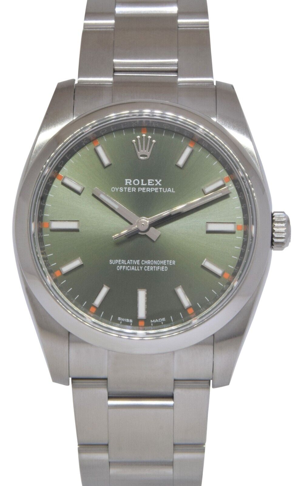 This Rolex Oyster Perpetual 114200 has a olive green baton dial and a bracelet strap. This Rolex has undergone a thorough inspection of water resistance, accuracy, functionality and condition to determine the level of reconditioning required to meet our strict standards. It has also been referenced against technical documents and manufacturer records where available to ensure authenticity and a clean history. All our watches have a 24-month warranty for your peace of mind. One of our skilled polishing technicians has removed marks on the case and bracelet of this watch, brought about by daily wear and tear, which is why this watch does not come with the remaining manufacturer’s warranty.