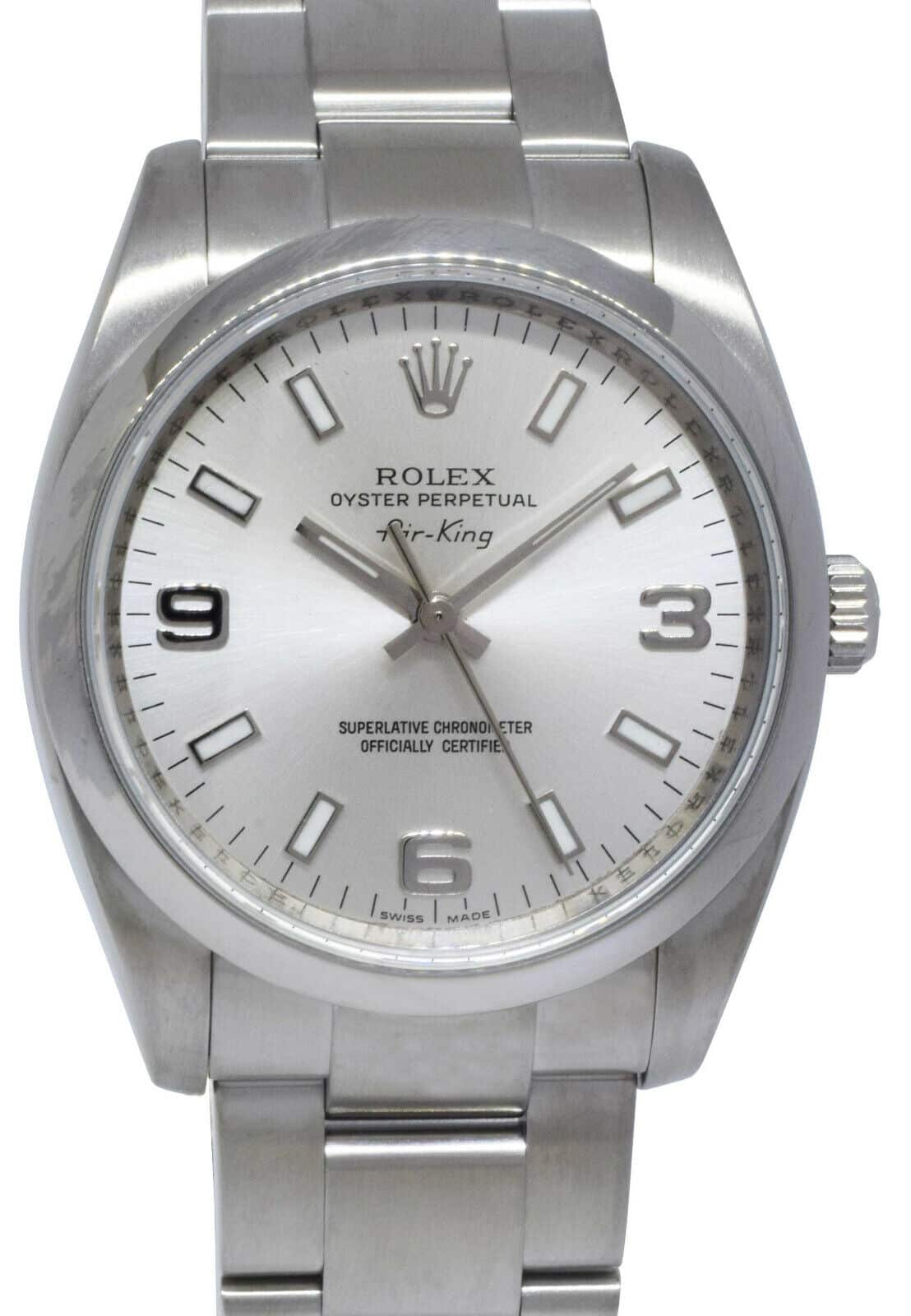 This Rolex Oyster Perpetual 114200 has a silver quarter arabic dial and a bracelet strap. This Rolex has undergone a thorough inspection of water resistance, accuracy, functionality and condition to determine the level of reconditioning required to meet our strict standards. It has also been referenced against technical documents and manufacturer records where available to ensure authenticity and a clean history. All our watches have a 24-month warranty for your peace of mind. One of our skilled polishing technicians has removed marks on the case and bracelet of this watch, brought about by daily wear and tear, which is why this watch does not come with the remaining manufacturer’s warranty.