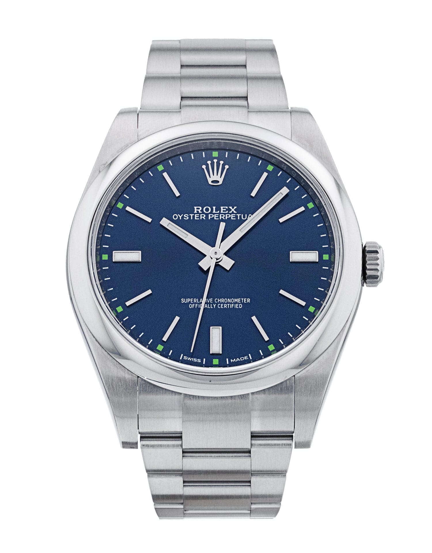 This Rolex Oyster Perpetual 114300 has a blue baton dial and a bracelet strap. This Rolex has undergone a thorough inspection of water resistance, accuracy, functionality and condition to determine the level of reconditioning required to meet our strict standards. It has also been referenced against technical documents and manufacturer records where available to ensure authenticity and a clean history. All our watches have a 24-month warranty for your peace of mind. One of our skilled polishing technicians has removed marks on the case and bracelet of this watch, brought about by daily wear and tear, which is why this watch does not come with the remaining manufacturer’s warranty.