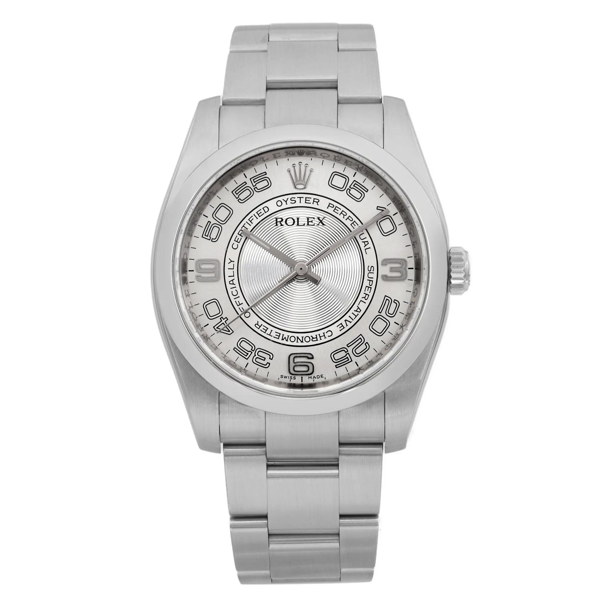 This Rolex Oyster Perpetual 116000 has a silver concentric arabic dial and a bracelet strap. This Rolex has undergone a thorough inspection of water resistance, accuracy, functionality and condition to determine the level of reconditioning required to meet our strict standards. It has also been referenced against technical documents and manufacturer records where available to ensure authenticity and a clean history. All our watches have a 24-month warranty for your peace of mind. One of our skilled polishing technicians has removed marks on the case and bracelet of this watch, brought about by daily wear and tear, which is why this watch does not come with the remaining manufacturer’s warranty.