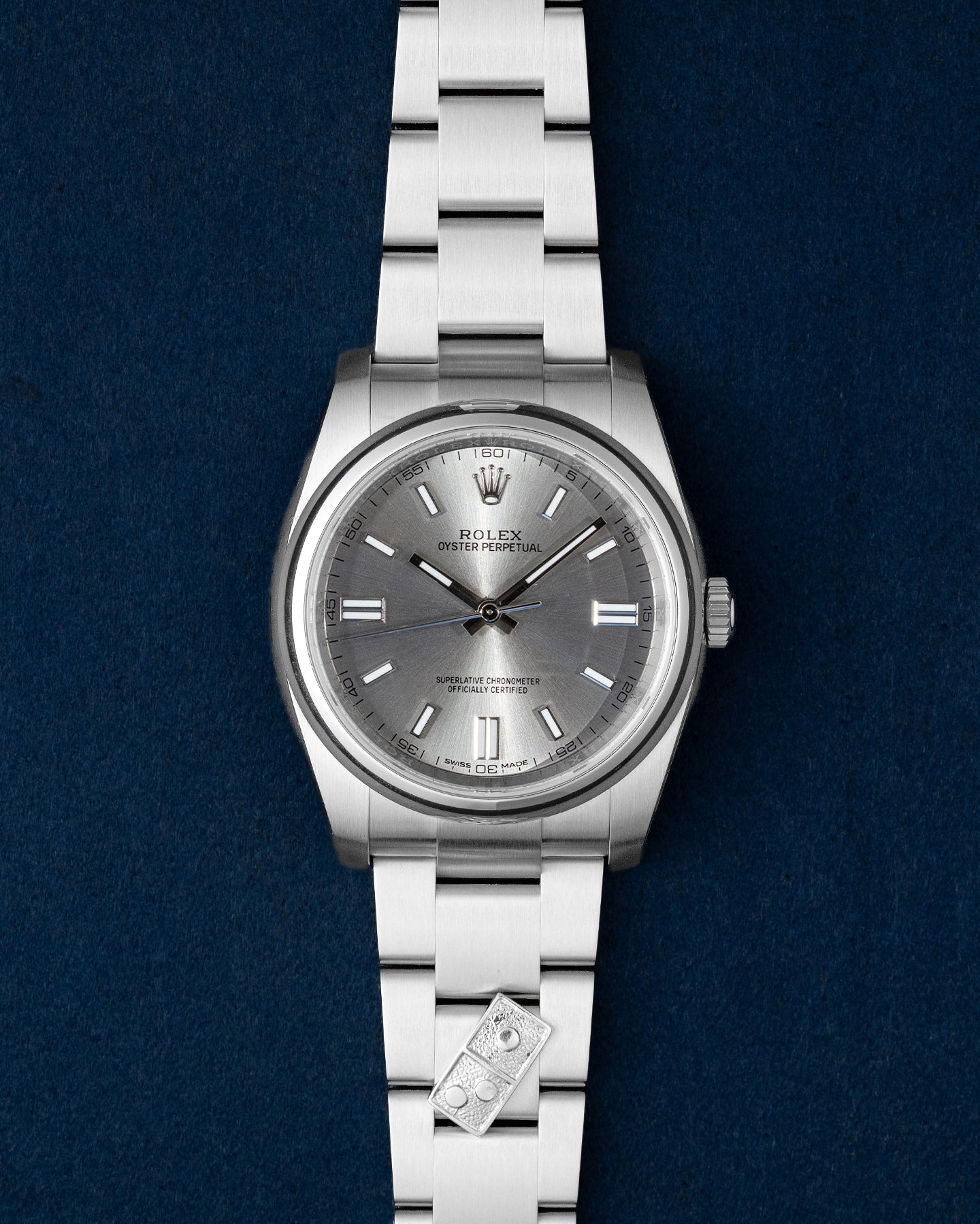 This Rolex Oyster Perpetual 116000 has a silver baton dial and a bracelet strap. This Rolex has undergone a thorough inspection of water resistance, accuracy, functionality and condition to determine the level of reconditioning required to meet our strict standards. It has also been referenced against technical documents and manufacturer records where available to ensure authenticity and a clean history. All our watches have a 24-month warranty for your peace of mind. One of our skilled polishing technicians has removed marks on the case and bracelet of this watch, brought about by daily wear and tear, which is why this watch does not come with the remaining manufacturer’s warranty.