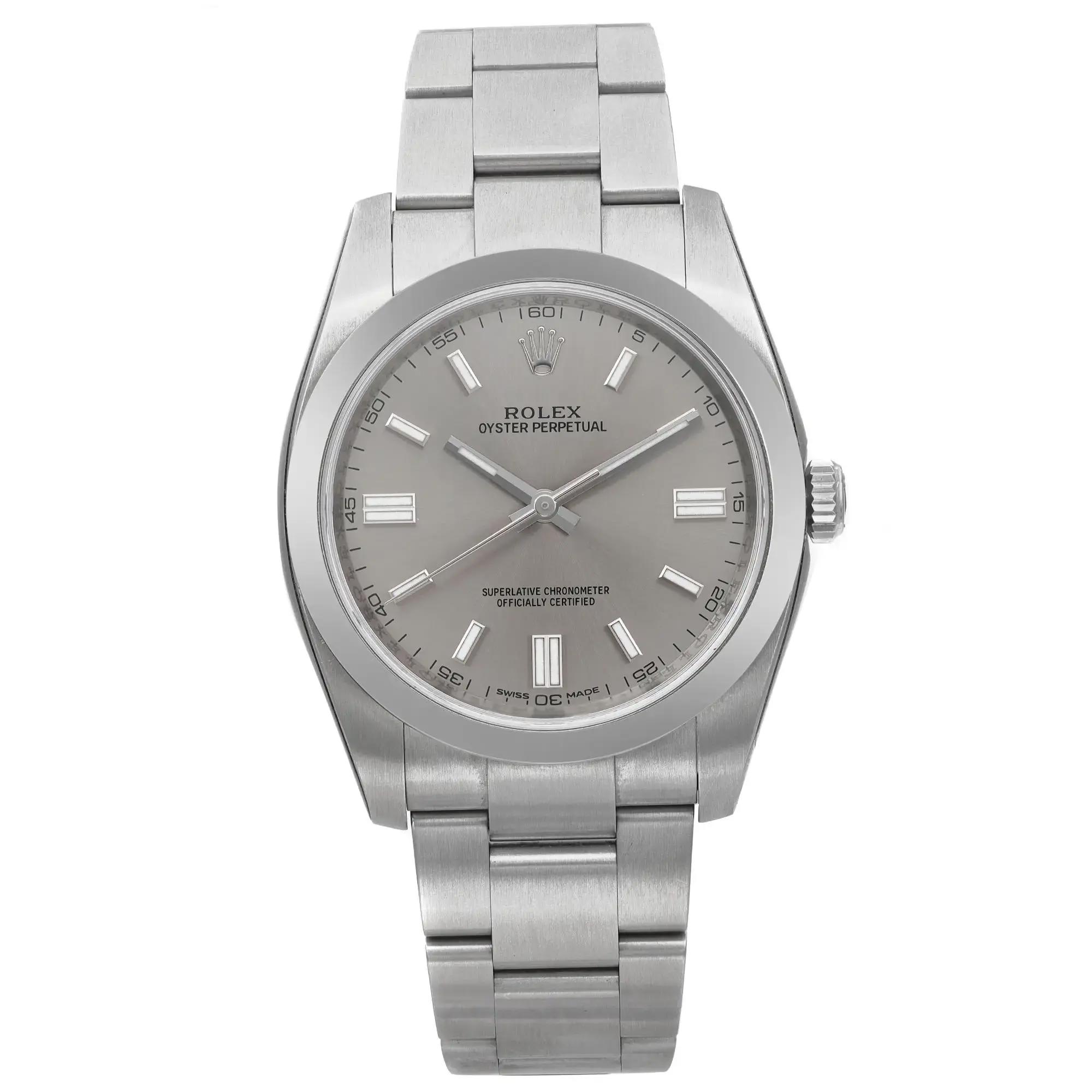 This Rolex Oyster Perpetual 116000 has a silver baton dial and a bracelet strap. This Rolex has undergone a thorough inspection of water resistance, accuracy, functionality and condition to determine the level of reconditioning required to meet our strict standards. It has also been referenced against technical documents and manufacturer records where available to ensure authenticity and a clean history. All our watches have a 24-month warranty for your peace of mind. One of our skilled polishing technicians has removed marks on the case and bracelet of this watch, brought about by daily wear and tear, which is why this watch does not come with the remaining manufacturer’s warranty.