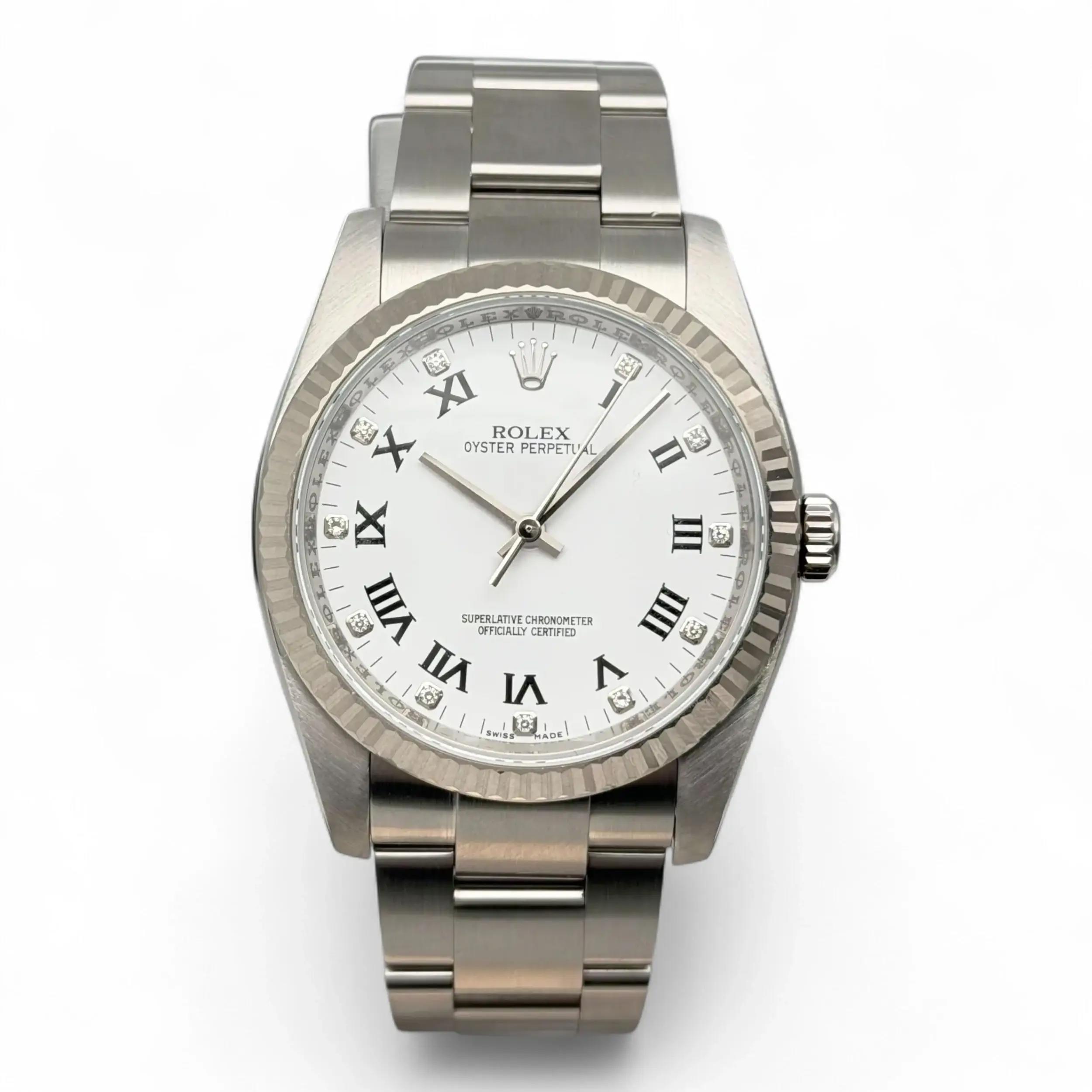 This Rolex Oyster Perpetual 116034 has a white diamond dial and a bracelet strap. This Rolex has undergone a thorough inspection of water resistance, accuracy, functionality and condition to determine the level of reconditioning required to meet our strict standards. It has also been referenced against technical documents and manufacturer records where available to ensure authenticity and a clean history. All our watches have a 24-month warranty for your peace of mind. One of our skilled polishing technicians has removed marks on the case and bracelet of this watch, brought about by daily wear and tear, which is why this watch does not come with the remaining manufacturer’s warranty.