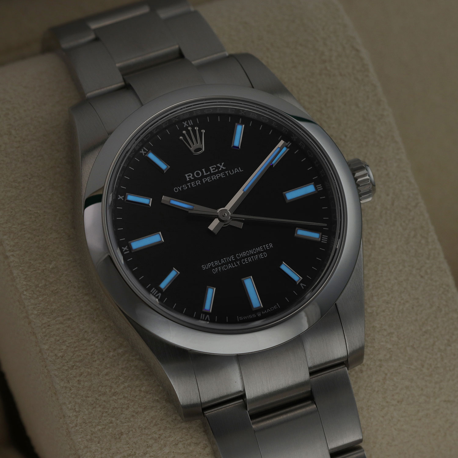 This Rolex Oyster Perpetual 124200 has a black baton dial and a bracelet strap. This Rolex has undergone a thorough inspection of water resistance, accuracy, functionality and condition to determine the level of reconditioning required to meet our strict standards. It has also been referenced against technical documents and manufacturer records where available to ensure authenticity and a clean history. Our watches have a 24-month warranty for your peace of mind, in conjunction with any remaining manufacturer’s warranty from new or from service. To maintain the manufacturer’s warranty on this watch, it has not been polished in our service centre.