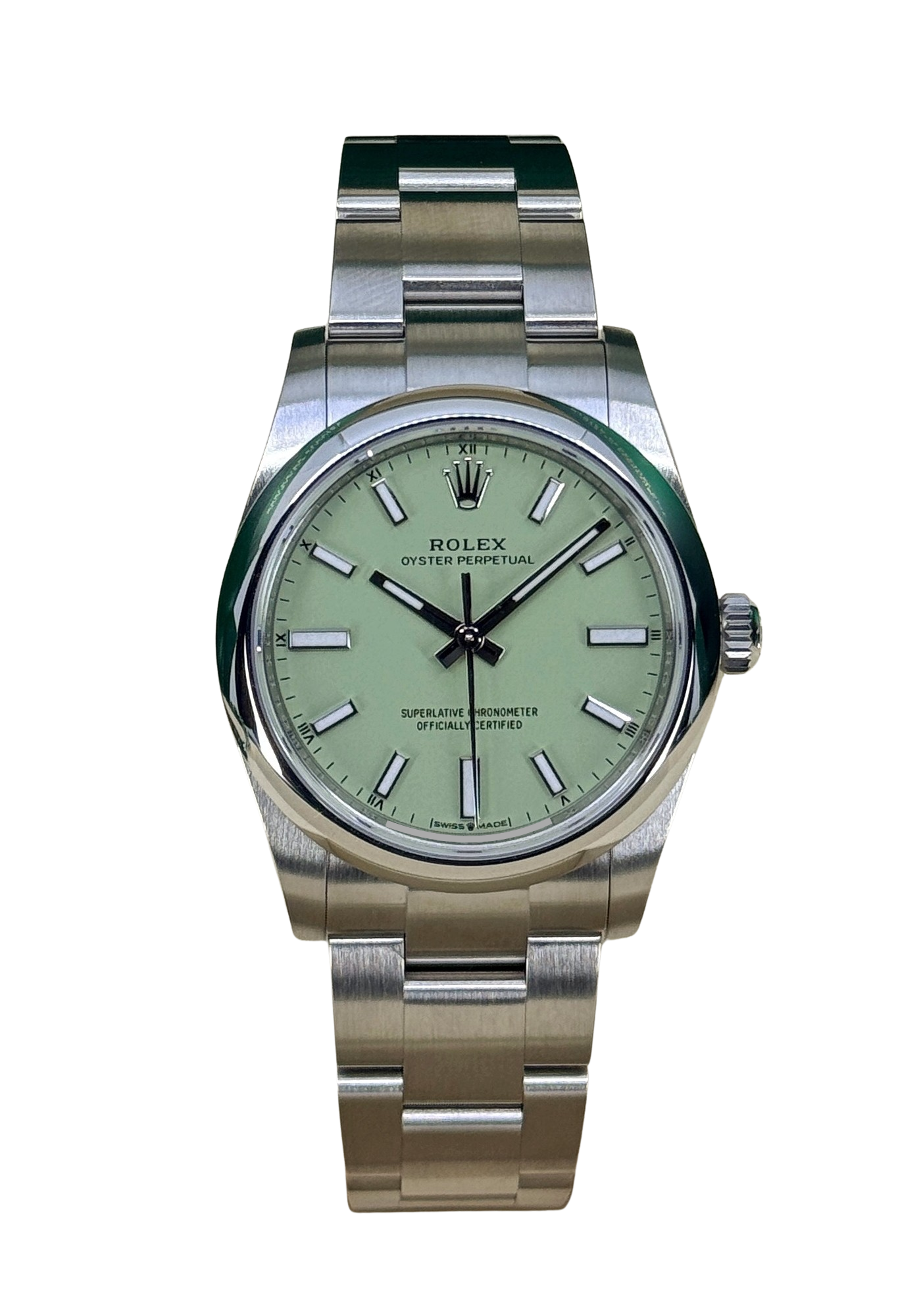 This Rolex Oyster Perpetual 124200 has a pistachio dial and a bracelet strap. This Rolex has undergone a thorough inspection of water resistance, accuracy, functionality and condition to determine the level of reconditioning required to meet our strict standards. It has also been referenced against technical documents and manufacturer records where available to ensure authenticity and a clean history. Our watches have a 24-month warranty for your peace of mind, in conjunction with any remaining manufacturer’s warranty from new or from service. To maintain the manufacturer’s warranty on this watch, it has not been polished in our service centre.
