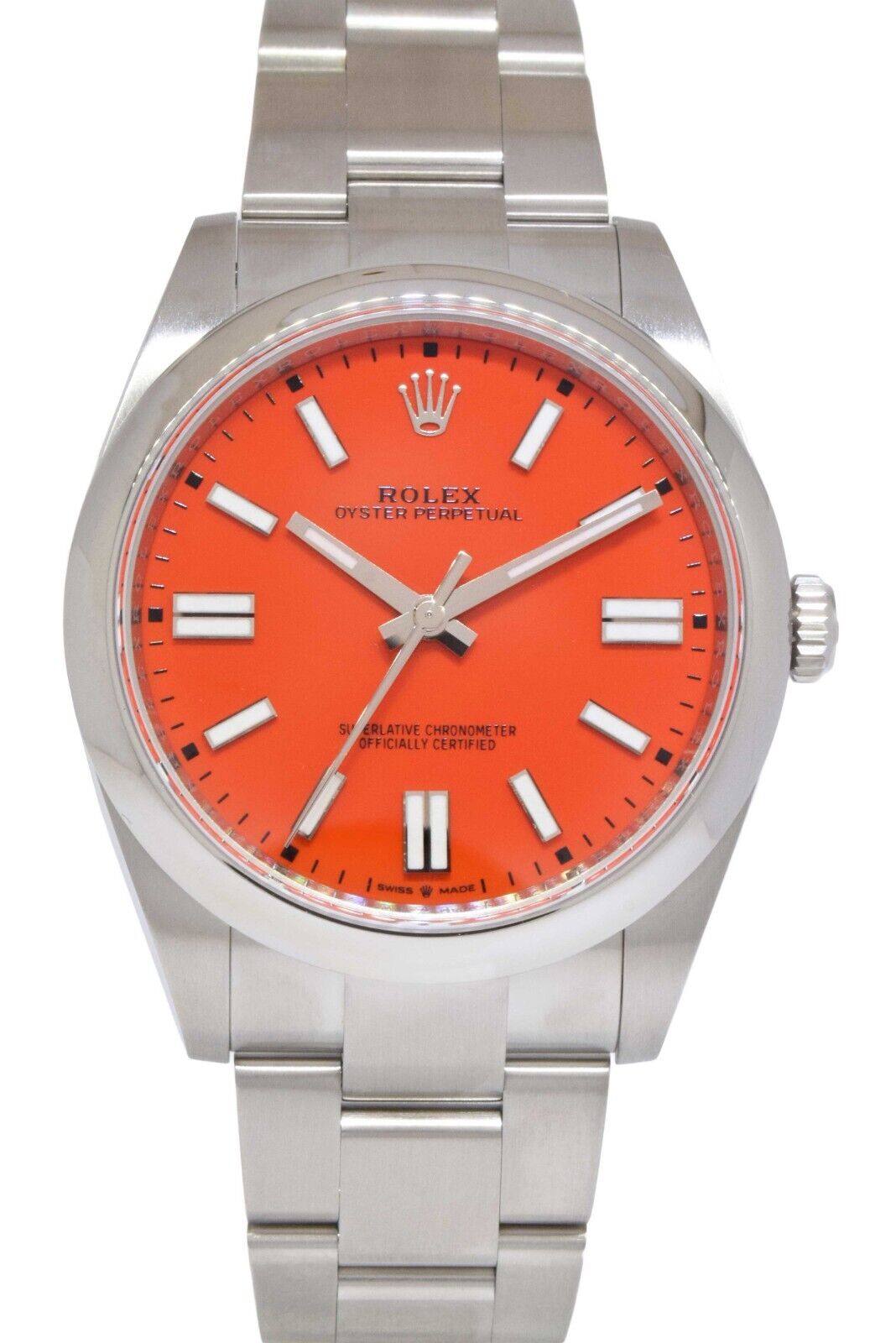 This Rolex Oyster Perpetual 124300 has a coral dial and a bracelet strap. This Rolex has undergone a thorough inspection of water resistance, accuracy, functionality and condition to determine the level of reconditioning required to meet our strict standards. It has also been referenced against technical documents and manufacturer records where available to ensure authenticity and a clean history. Our watches have a 24-month warranty for your peace of mind, in conjunction with any remaining manufacturer’s warranty from new or from service. To maintain the manufacturer’s warranty on this watch, it has not been polished in our service centre.