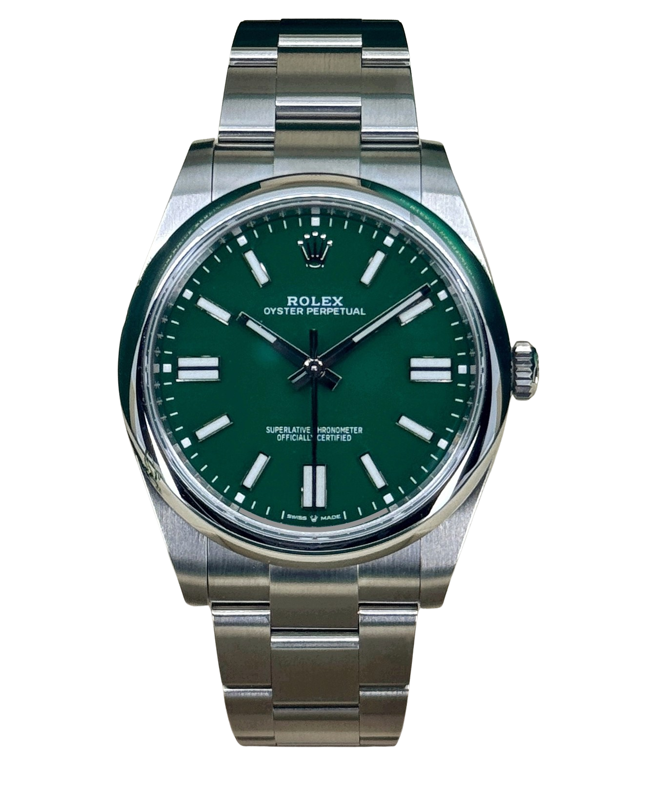 This Rolex Oyster Perpetual 124300 has a green baton dial and a bracelet strap. This Rolex has undergone a thorough inspection of water resistance, accuracy, functionality and condition to determine the level of reconditioning required to meet our strict standards. It has also been referenced against technical documents and manufacturer records where available to ensure authenticity and a clean history. Our watches have a 24-month warranty for your peace of mind, in conjunction with any remaining manufacturer’s warranty from new or from service. To maintain the manufacturer’s warranty on this watch, it has not been polished in our service centre.