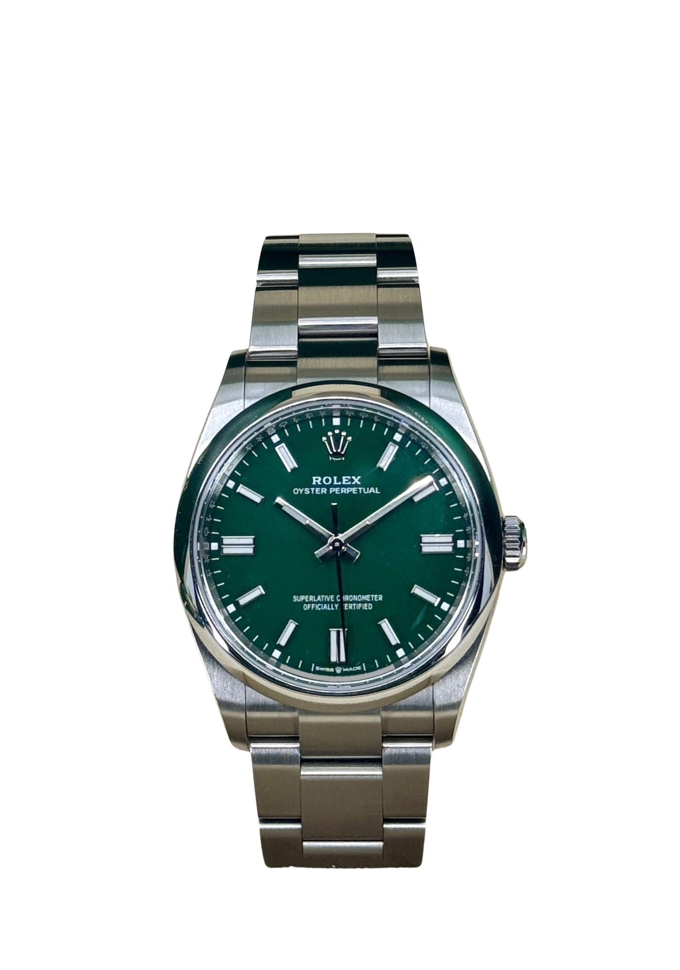 This Rolex Oyster Perpetual 126000 has a green baton dial and a bracelet strap. This Rolex has undergone a thorough inspection of water resistance, accuracy, functionality and condition to determine the level of reconditioning required to meet our strict standards. It has also been referenced against technical documents and manufacturer records where available to ensure authenticity and a clean history. Our watches have a 24-month warranty for your peace of mind, in conjunction with any remaining manufacturer’s warranty from new or from service. To maintain the manufacturer’s warranty on this watch, it has not been polished in our service centre.