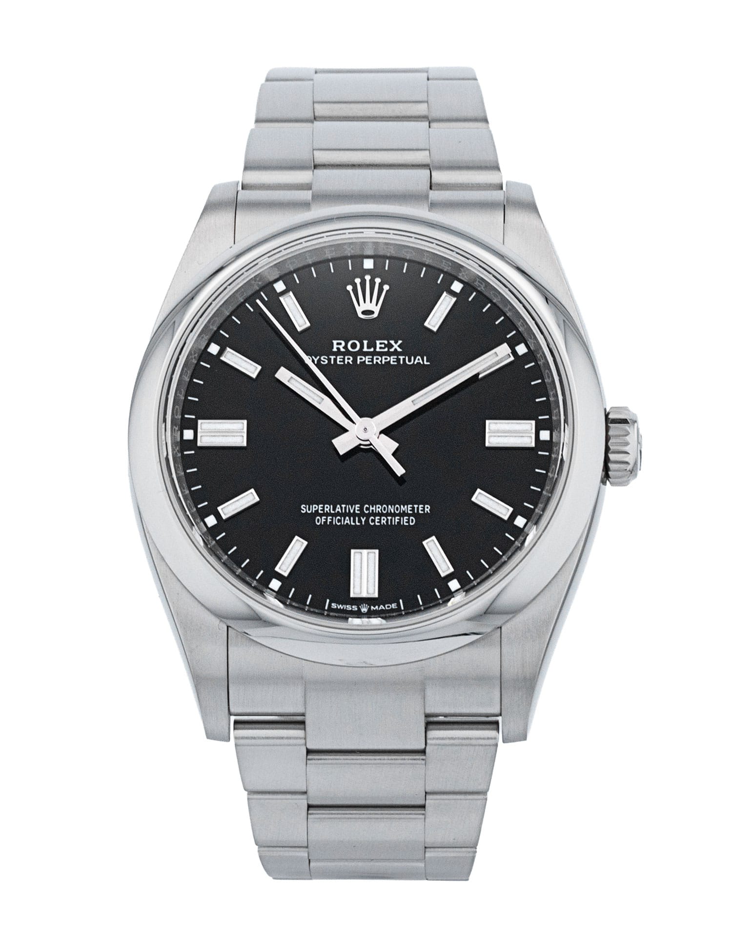 This Rolex Oyster Perpetual 126000 has a black baton dial and a bracelet strap. This Rolex has undergone a thorough inspection of water resistance, accuracy, functionality and condition to determine the level of reconditioning required to meet our strict standards. It has also been referenced against technical documents and manufacturer records where available to ensure authenticity and a clean history. Our watches have a 24-month warranty for your peace of mind, in conjunction with any remaining manufacturer’s warranty from new or from service. To maintain the manufacturer’s warranty on this watch, it has not been polished in our service centre.
