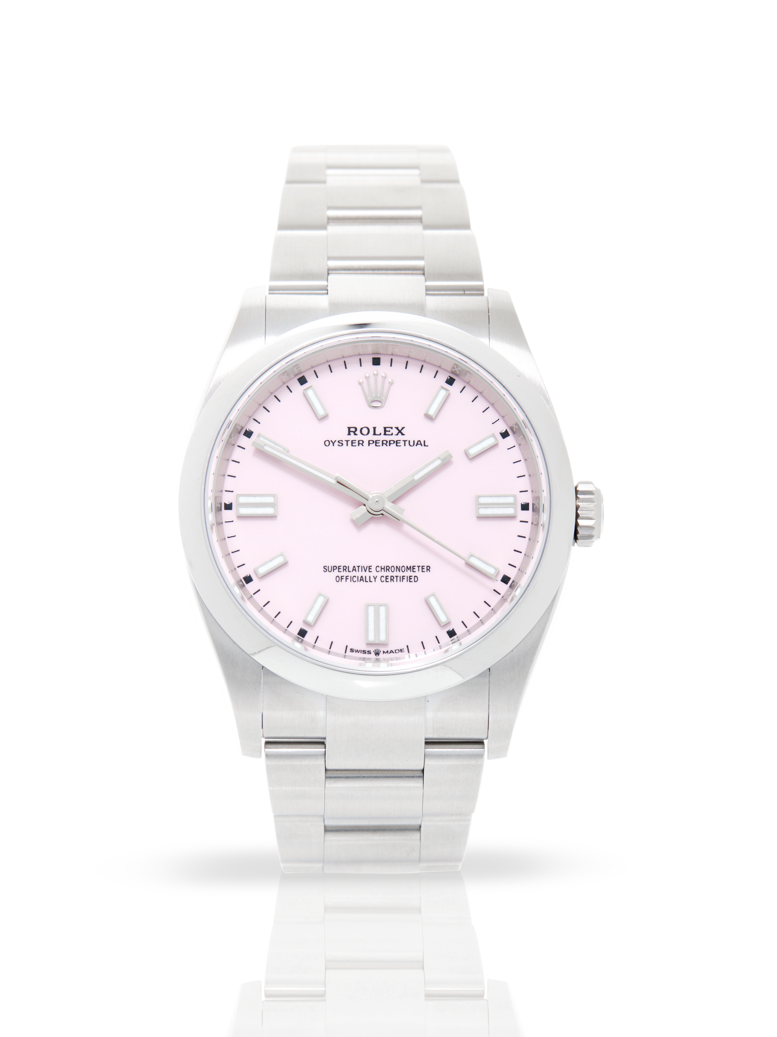 This Rolex Oyster Perpetual 126000 has a candy pink dial and a bracelet strap. This Rolex has undergone a thorough inspection of water resistance, accuracy, functionality and condition to determine the level of reconditioning required to meet our strict standards. It has also been referenced against technical documents and manufacturer records where available to ensure authenticity and a clean history. Our watches have a 24-month warranty for your peace of mind, in conjunction with any remaining manufacturer’s warranty from new or from service. To maintain the manufacturer’s warranty on this watch, it has not been polished in our service centre.