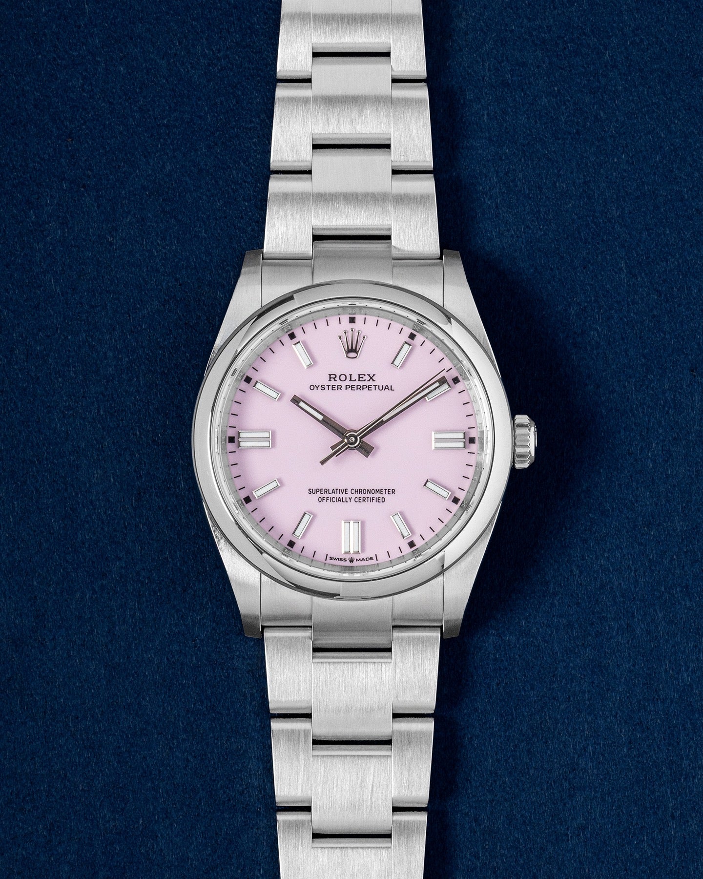 This Rolex Oyster Perpetual 126000 has a candy pink dial and a bracelet strap. This Rolex has undergone a thorough inspection of water resistance, accuracy, functionality and condition to determine the level of reconditioning required to meet our strict standards. It has also been referenced against technical documents and manufacturer records where available to ensure authenticity and a clean history. Our watches have a 24-month warranty for your peace of mind, in conjunction with any remaining manufacturer’s warranty from new or from service. To maintain the manufacturer’s warranty on this watch, it has not been polished in our service centre.