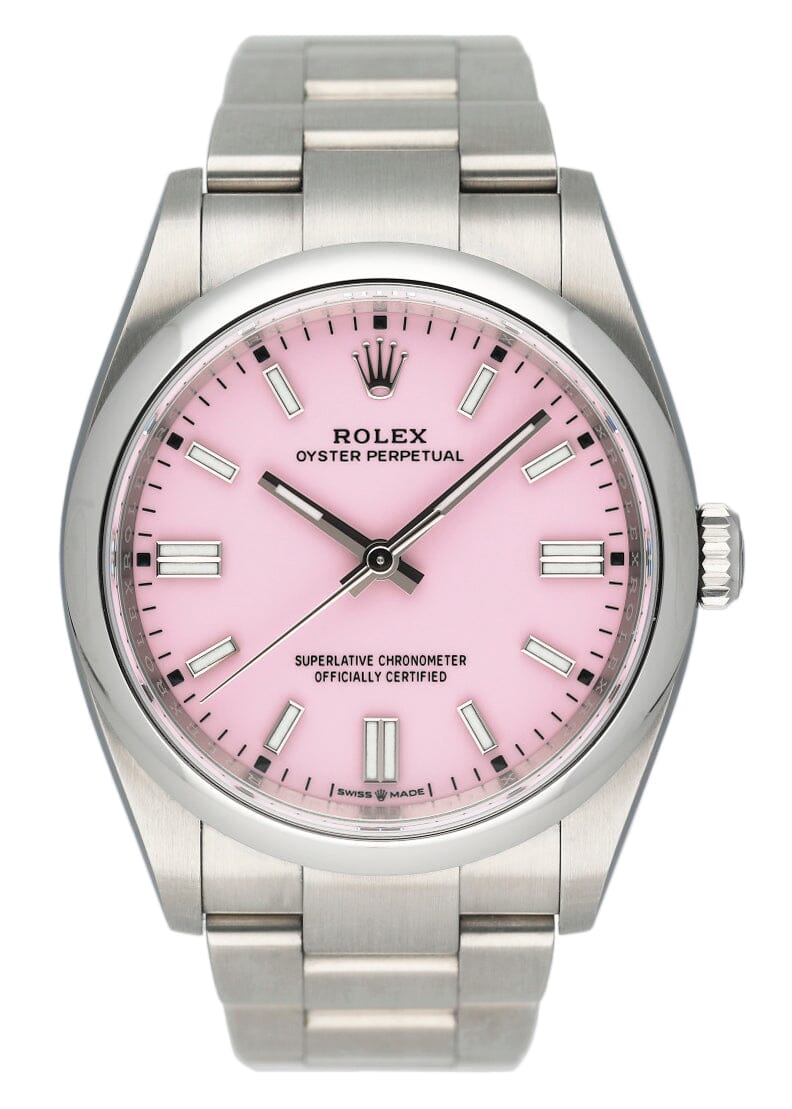 This Rolex Oyster Perpetual 126000 has a candy pink dial and a bracelet strap. This Rolex has undergone a thorough inspection of water resistance, accuracy, functionality and condition to determine the level of reconditioning required to meet our strict standards. It has also been referenced against technical documents and manufacturer records where available to ensure authenticity and a clean history. Our watches have a 24-month warranty for your peace of mind, in conjunction with any remaining manufacturer’s warranty from new or from service. To maintain the manufacturer’s warranty on this watch, it has not been polished in our service centre.