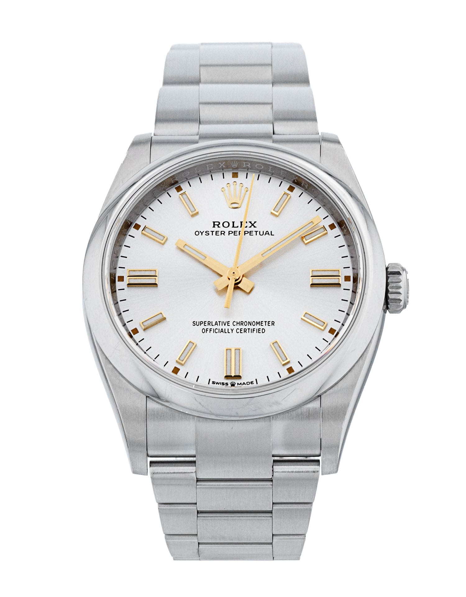 This Rolex Oyster Perpetual 126000 has a silver baton dial and a bracelet strap. This Rolex has undergone a thorough inspection of water resistance, accuracy, functionality and condition to determine the level of reconditioning required to meet our strict standards. It has also been referenced against technical documents and manufacturer records where available to ensure authenticity and a clean history. Our watches have a 24-month warranty for your peace of mind, in conjunction with any remaining manufacturer’s warranty from new or from service. To maintain the manufacturer’s warranty on this watch, it has not been polished in our service centre.