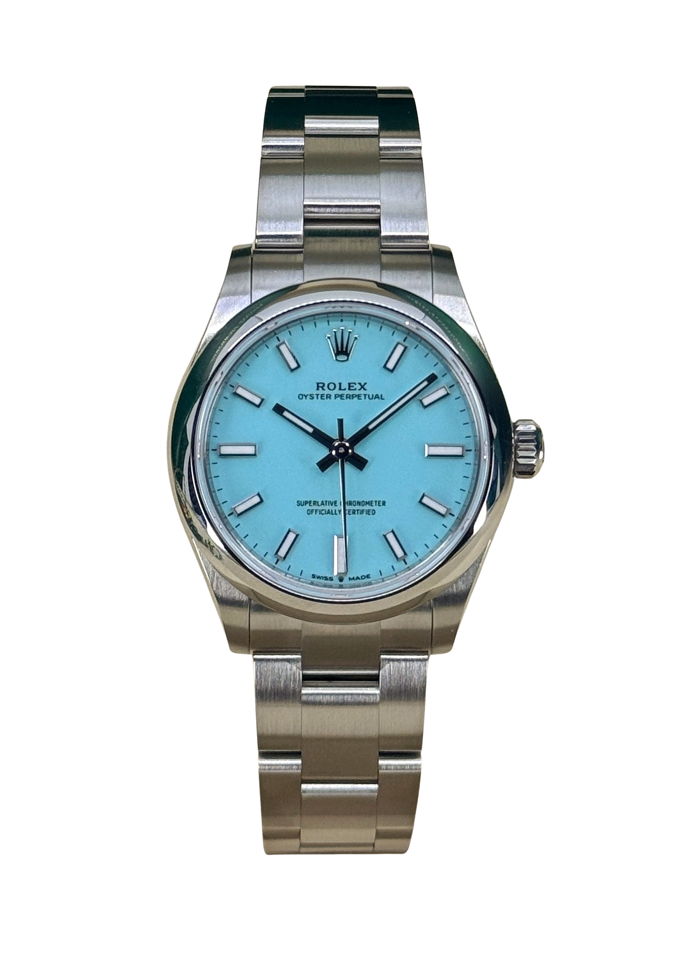 This Rolex Oyster Perpetual 277200 has a turquoise dial and a bracelet strap. This Rolex has undergone a thorough inspection of water resistance, accuracy, functionality and condition to determine the level of reconditioning required to meet our strict standards. It has also been referenced against technical documents and manufacturer records where available to ensure authenticity and a clean history. Our watches have a 24-month warranty for your peace of mind, in conjunction with any remaining manufacturer’s warranty from new or from service. To maintain the manufacturer’s warranty on this watch, it has not been polished in our service centre.