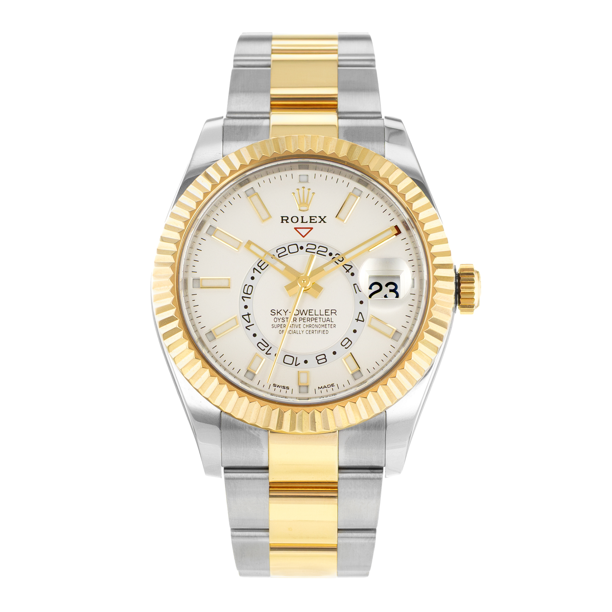 This Rolex Sky-Dweller 326933 has a white baton dial and a bracelet strap. This Rolex has undergone a thorough inspection of water resistance, accuracy, functionality and condition to determine the level of reconditioning required to meet our strict standards. It has also been referenced against technical documents and manufacturer records where available to ensure authenticity and a clean history. All our watches have a 24-month warranty for your peace of mind. One of our skilled polishing technicians has removed marks on the case and bracelet of this watch, brought about by daily wear and tear, which is why this watch does not come with the remaining manufacturer’s warranty.