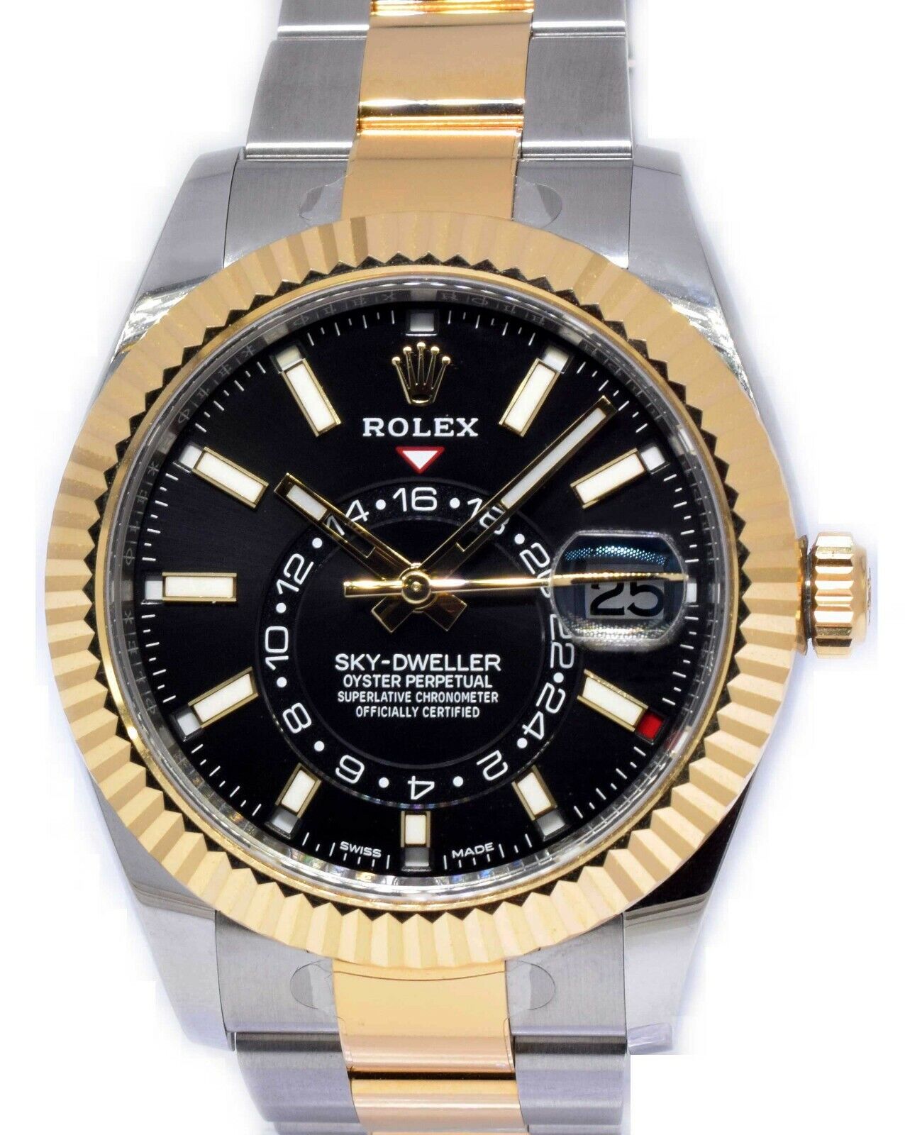 This Rolex Sky-Dweller 326933 has a black baton dial and a bracelet strap. This Rolex has undergone a thorough inspection of water resistance, accuracy, functionality and condition to determine the level of reconditioning required to meet our strict standards. It has also been referenced against technical documents and manufacturer records where available to ensure authenticity and a clean history. Our watches have a 24-month warranty for your peace of mind, in conjunction with any remaining manufacturer’s warranty from new or from service. To maintain the manufacturer’s warranty on this watch, it has not been polished in our service centre.
