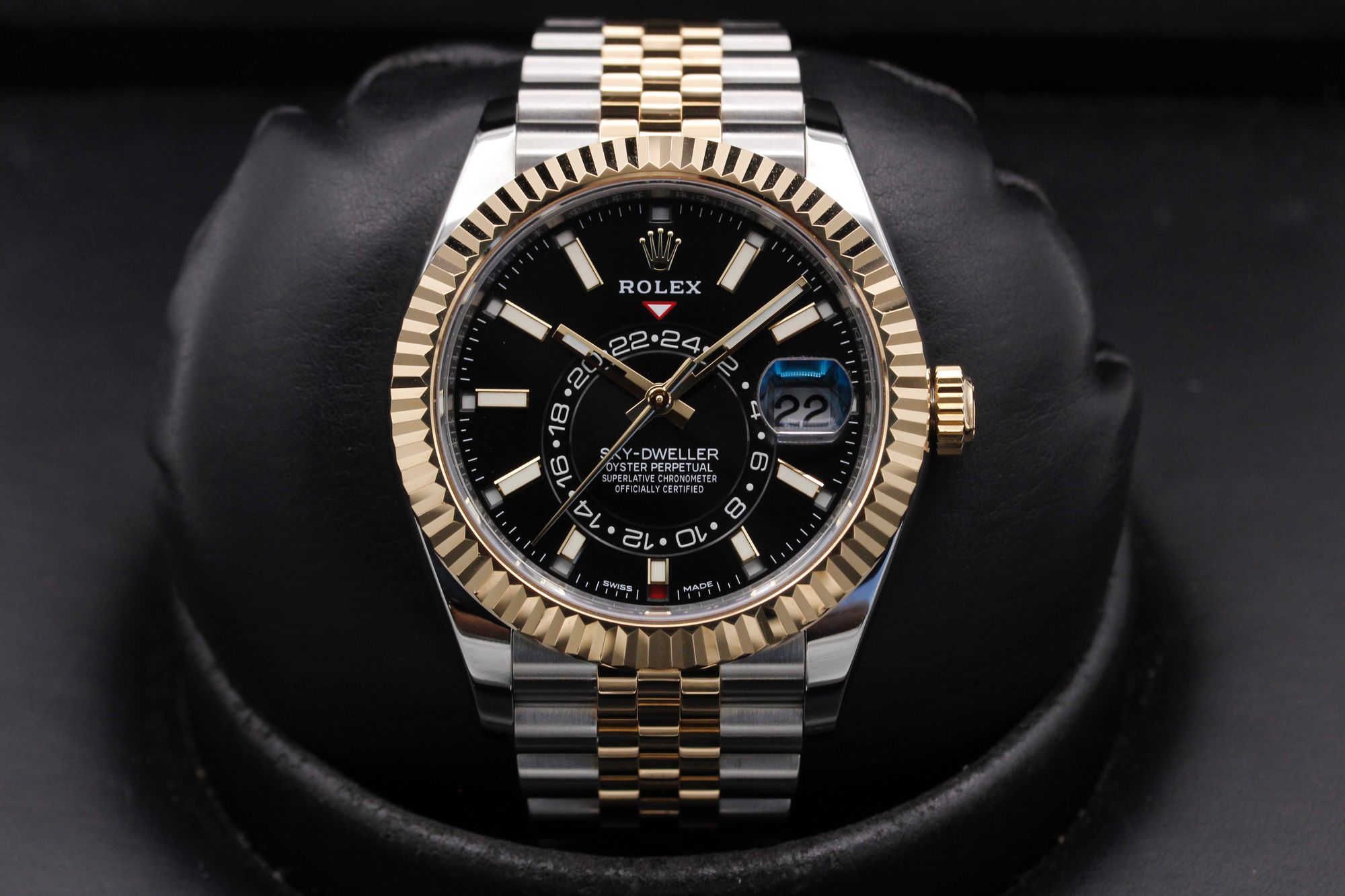This Rolex Sky-Dweller 326933 has a black baton dial and a bracelet strap. This Rolex has undergone a thorough inspection of water resistance, accuracy, functionality and condition to determine the level of reconditioning required to meet our strict standards. It has also been referenced against technical documents and manufacturer records where available to ensure authenticity and a clean history. All our watches have a 24-month warranty for your peace of mind. One of our skilled polishing technicians has removed marks on the case and bracelet of this watch, brought about by daily wear and tear, which is why this watch does not come with the remaining manufacturer’s warranty.