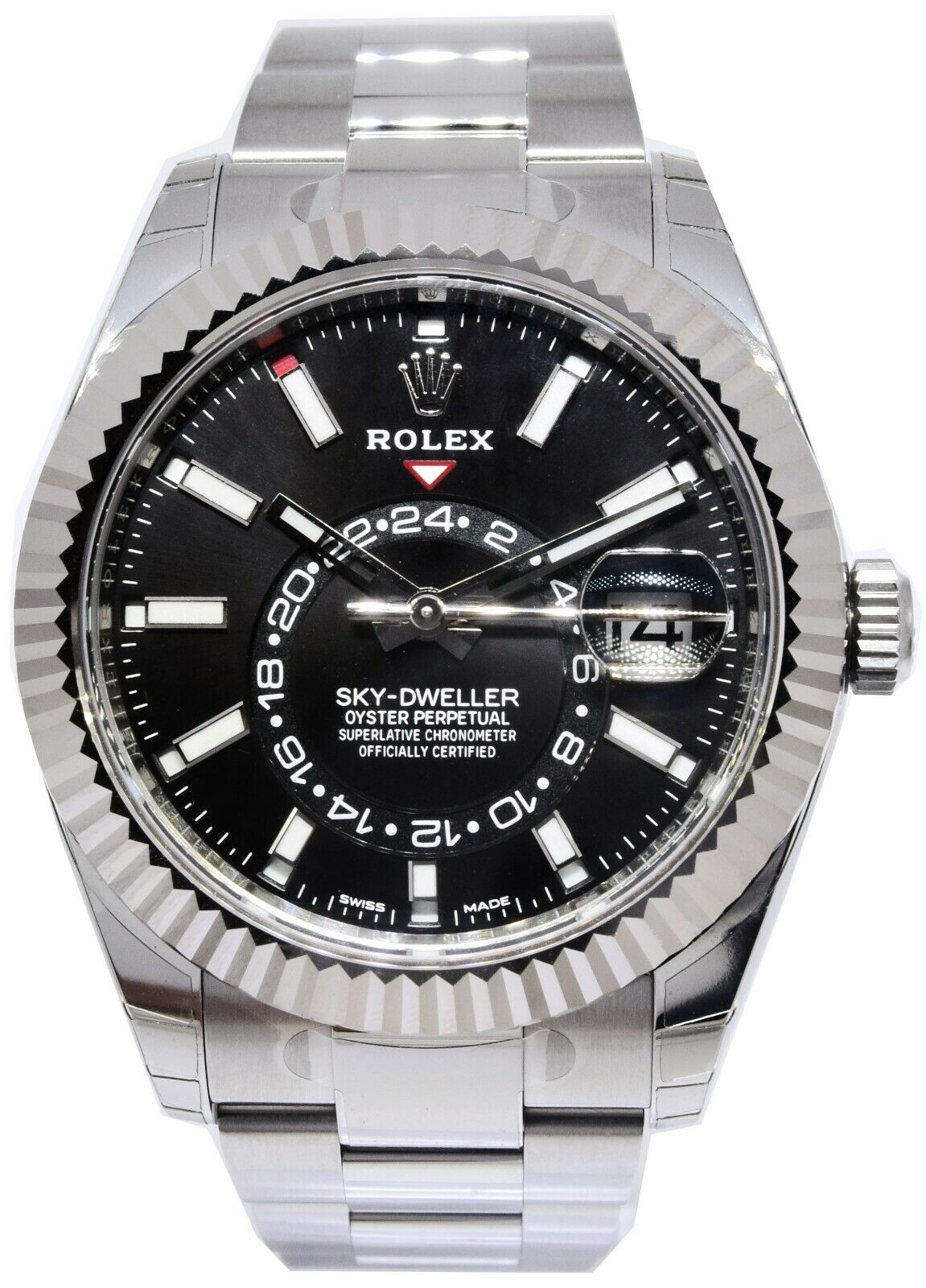 This Rolex Sky-Dweller 326934 has a black baton dial and a bracelet strap. This Rolex has undergone a thorough inspection of water resistance, accuracy, functionality and condition to determine the level of reconditioning required to meet our strict standards. It has also been referenced against technical documents and manufacturer records where available to ensure authenticity and a clean history. Our watches have a 24-month warranty for your peace of mind, in conjunction with any remaining manufacturer’s warranty from new or from service. To maintain the manufacturer’s warranty on this watch, it has not been polished in our service centre.
