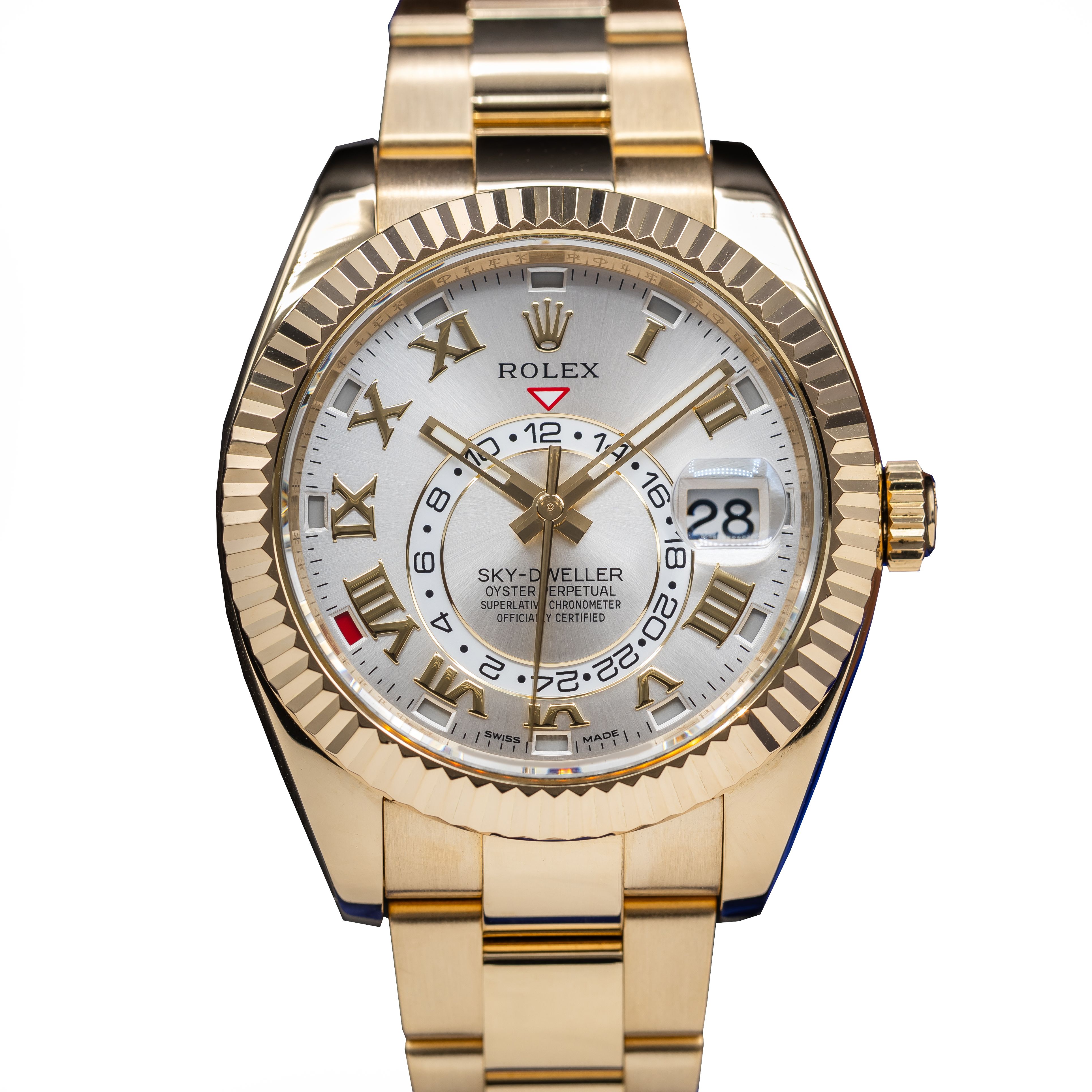 This Rolex Sky-Dweller 326938 has a silver roman numeral dial and a bracelet strap. This Rolex has undergone a thorough inspection of water resistance, accuracy, functionality and condition to determine the level of reconditioning required to meet our strict standards. It has also been referenced against technical documents and manufacturer records where available to ensure authenticity and a clean history. All our watches have a 24-month warranty for your peace of mind. One of our skilled polishing technicians has removed marks on the case and bracelet of this watch, brought about by daily wear and tear, which is why this watch does not come with the remaining manufacturer’s warranty.