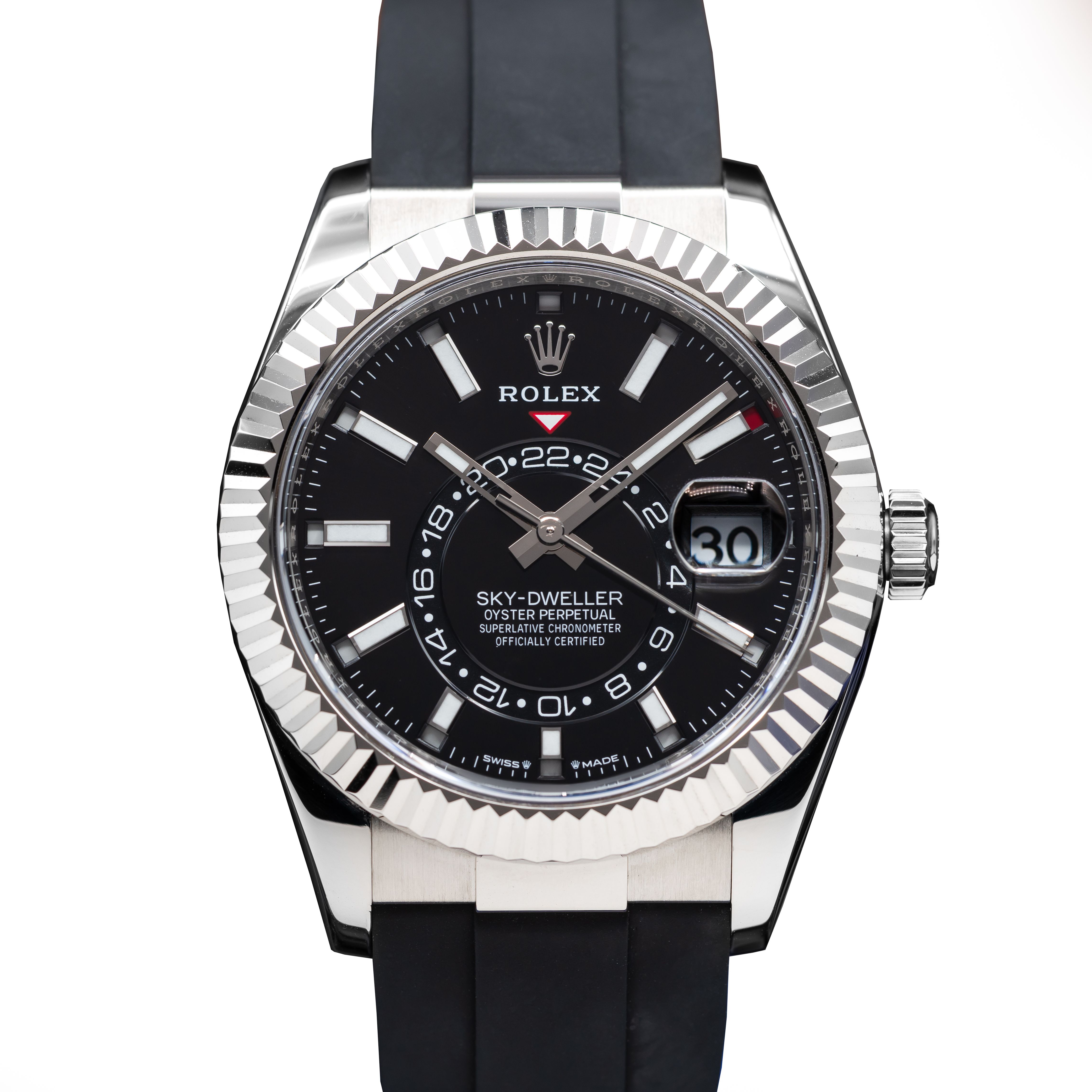This Rolex Sky-Dweller 336239 has a black dial and a rubber strap. This Rolex has undergone a thorough inspection of water resistance, accuracy, functionality and condition to determine the level of reconditioning required to meet our strict standards. It has also been referenced against technical documents and manufacturer records where available to ensure authenticity and a clean history. Our watches have a 24-month warranty for your peace of mind, in conjunction with any remaining manufacturer’s warranty from new or from service. To maintain the manufacturer’s warranty on this watch, it has not been polished in our service centre.