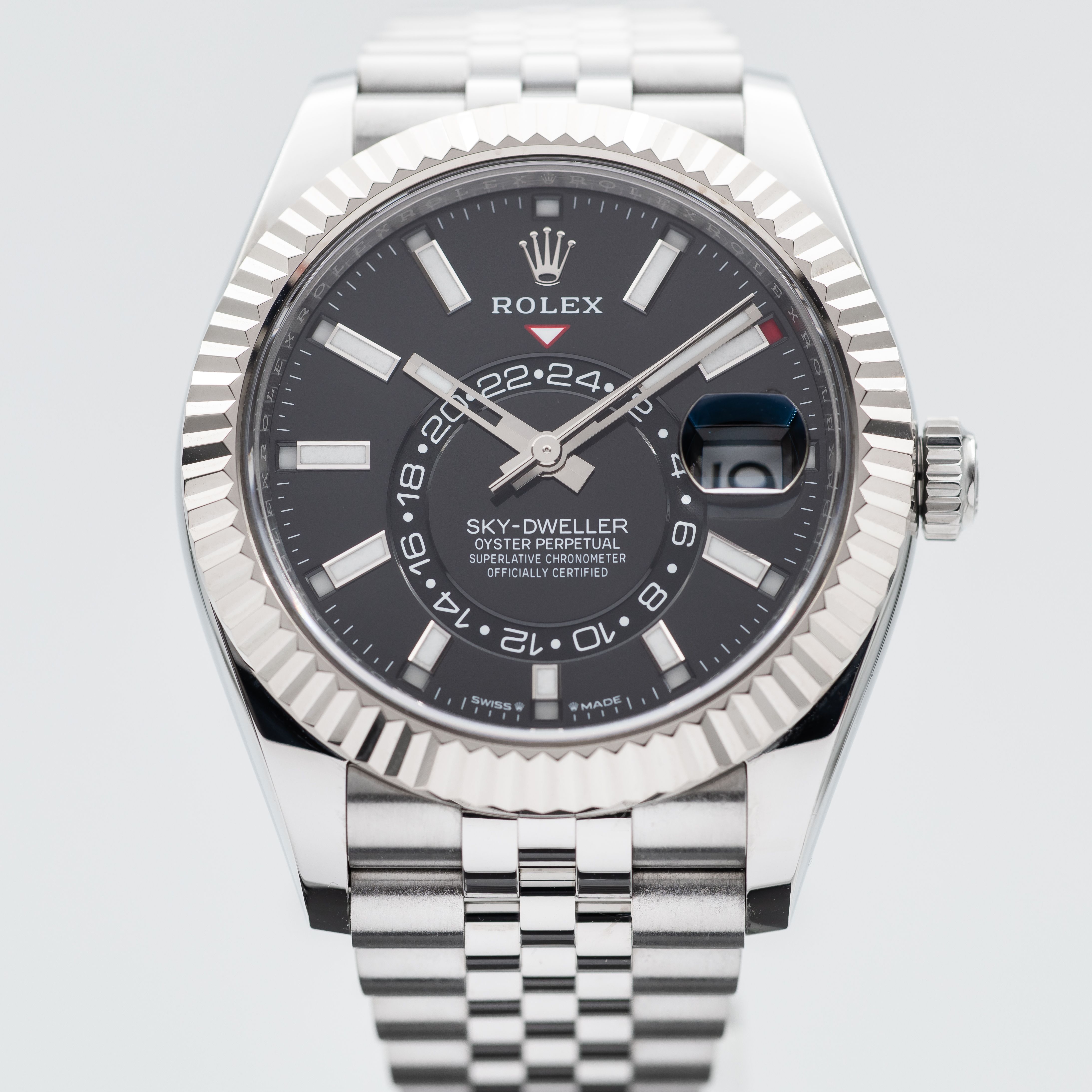 This Rolex Sky-Dweller 336934 has a black dial and a bracelet strap. This Rolex has undergone a thorough inspection of water resistance, accuracy, functionality and condition to determine the level of reconditioning required to meet our strict standards. It has also been referenced against technical documents and manufacturer records where available to ensure authenticity and a clean history. Our watches have a 24-month warranty for your peace of mind, in conjunction with any remaining manufacturer’s warranty from new or from service. To maintain the manufacturer’s warranty on this watch, it has not been polished in our service centre.