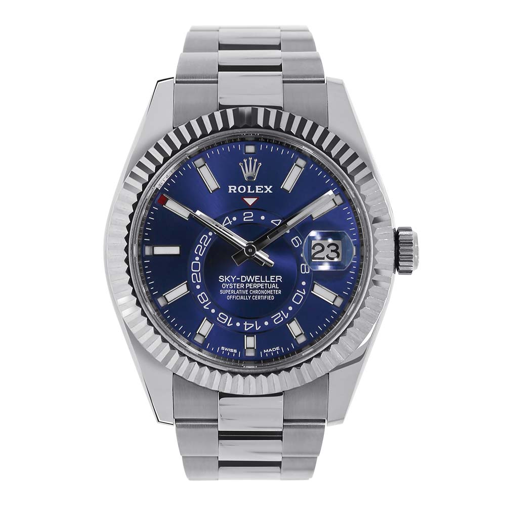 This Rolex Sky-Dweller 336934 has a blue dial and a bracelet strap. This Rolex has undergone a thorough inspection of water resistance, accuracy, functionality and condition to determine the level of reconditioning required to meet our strict standards. It has also been referenced against technical documents and manufacturer records where available to ensure authenticity and a clean history. All our watches have a 24-month warranty for your peace of mind. One of our skilled polishing technicians has removed marks on the case and bracelet of this watch, brought about by daily wear and tear, which is why this watch does not come with the remaining manufacturer’s warranty.