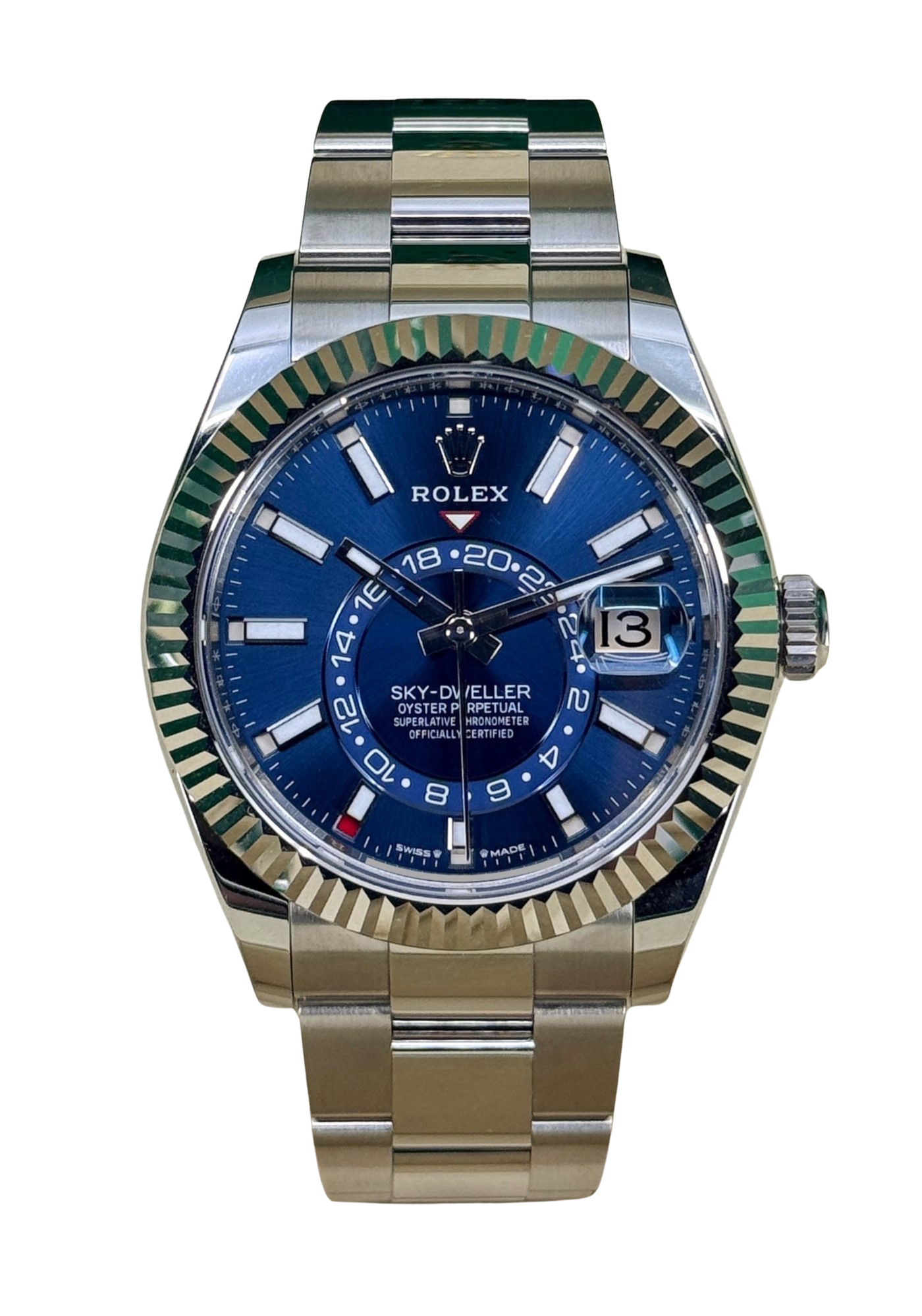 This Rolex Sky-Dweller 336934 has a blue dial and a bracelet strap. This Rolex has undergone a thorough inspection of water resistance, accuracy, functionality and condition to determine the level of reconditioning required to meet our strict standards. It has also been referenced against technical documents and manufacturer records where available to ensure authenticity and a clean history. Our watches have a 24-month warranty for your peace of mind, in conjunction with any remaining manufacturer’s warranty from new or from service. To maintain the manufacturer’s warranty on this watch, it has not been polished in our service centre.