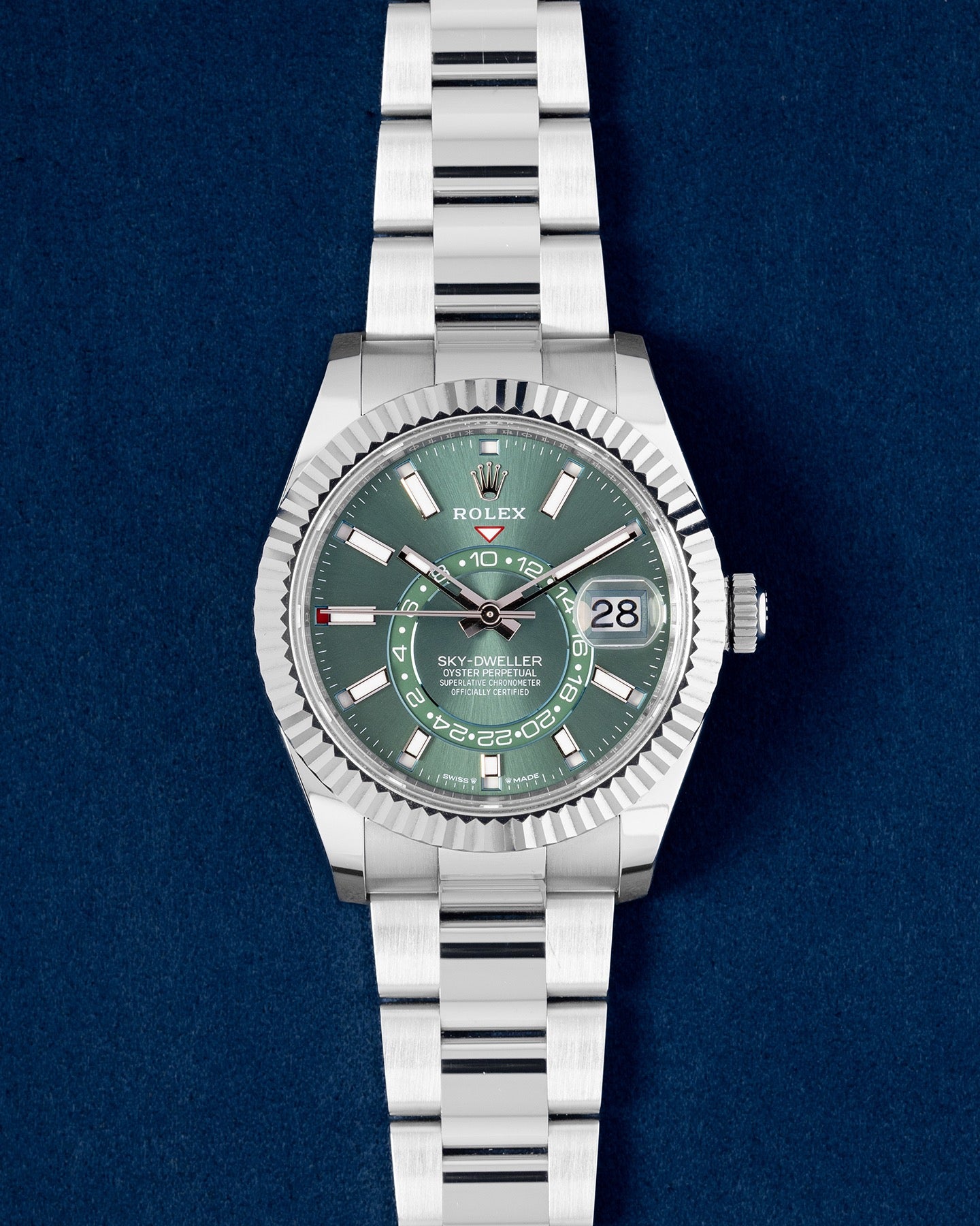 This Rolex Sky-Dweller 336934 has a mint green baton dial and a bracelet strap. This Rolex has undergone a thorough inspection of water resistance, accuracy, functionality and condition to determine the level of reconditioning required to meet our strict standards. It has also been referenced against technical documents and manufacturer records where available to ensure authenticity and a clean history. Our watches have a 24-month warranty for your peace of mind, in conjunction with any remaining manufacturer’s warranty from new or from service. To maintain the manufacturer’s warranty on this watch, it has not been polished in our service centre.