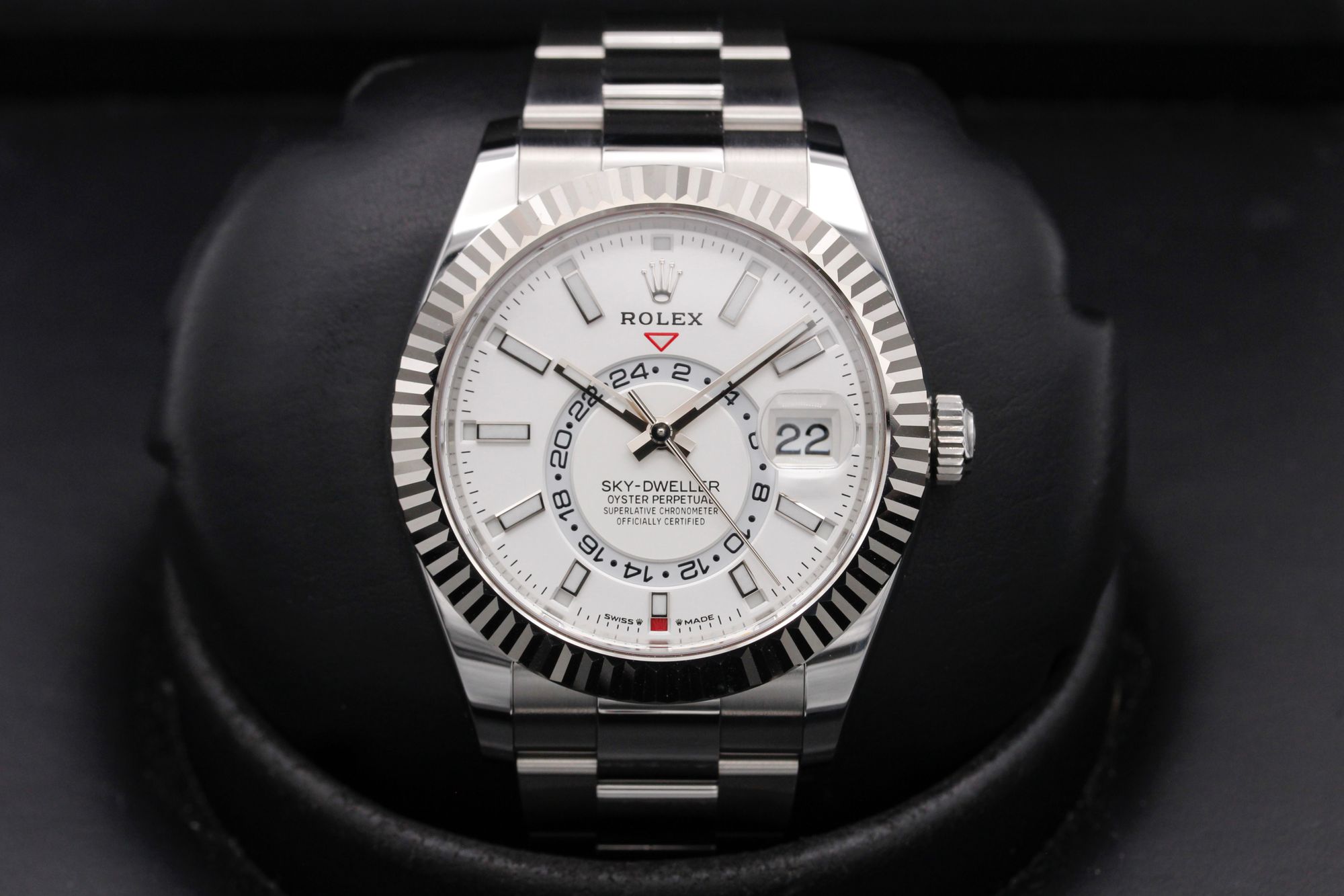 This Rolex Sky-Dweller 336934 has a white dial and a bracelet strap. This Rolex has undergone a thorough inspection of water resistance, accuracy, functionality and condition to determine the level of reconditioning required to meet our strict standards. It has also been referenced against technical documents and manufacturer records where available to ensure authenticity and a clean history. Our watches have a 24-month warranty for your peace of mind, in conjunction with any remaining manufacturer’s warranty from new or from service. To maintain the manufacturer’s warranty on this watch, it has not been polished in our service centre.