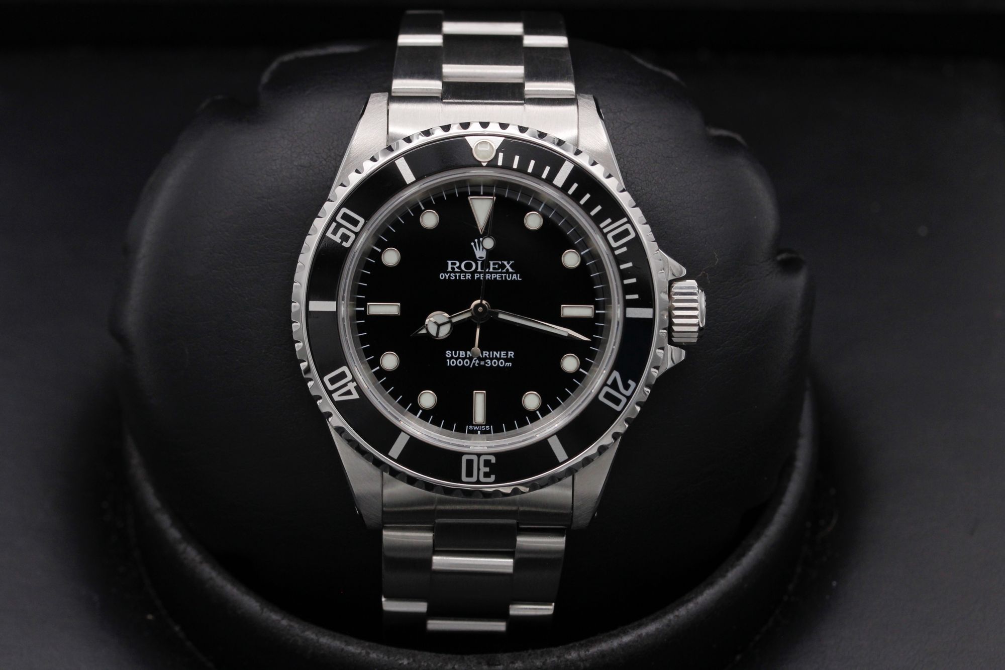 This Rolex Submariner 14060 has a black dial and a bracelet strap. This Rolex has undergone a thorough inspection of water resistance, accuracy, functionality and condition to determine the level of reconditioning required to meet our strict standards. It has also been referenced against technical documents and manufacturer records where available to ensure authenticity and a clean history. All our watches have a 24-month warranty for your peace of mind. One of our skilled polishing technicians has removed marks on the case and bracelet of this watch, brought about by daily wear and tear, which is why this watch does not come with the remaining manufacturer’s warranty.