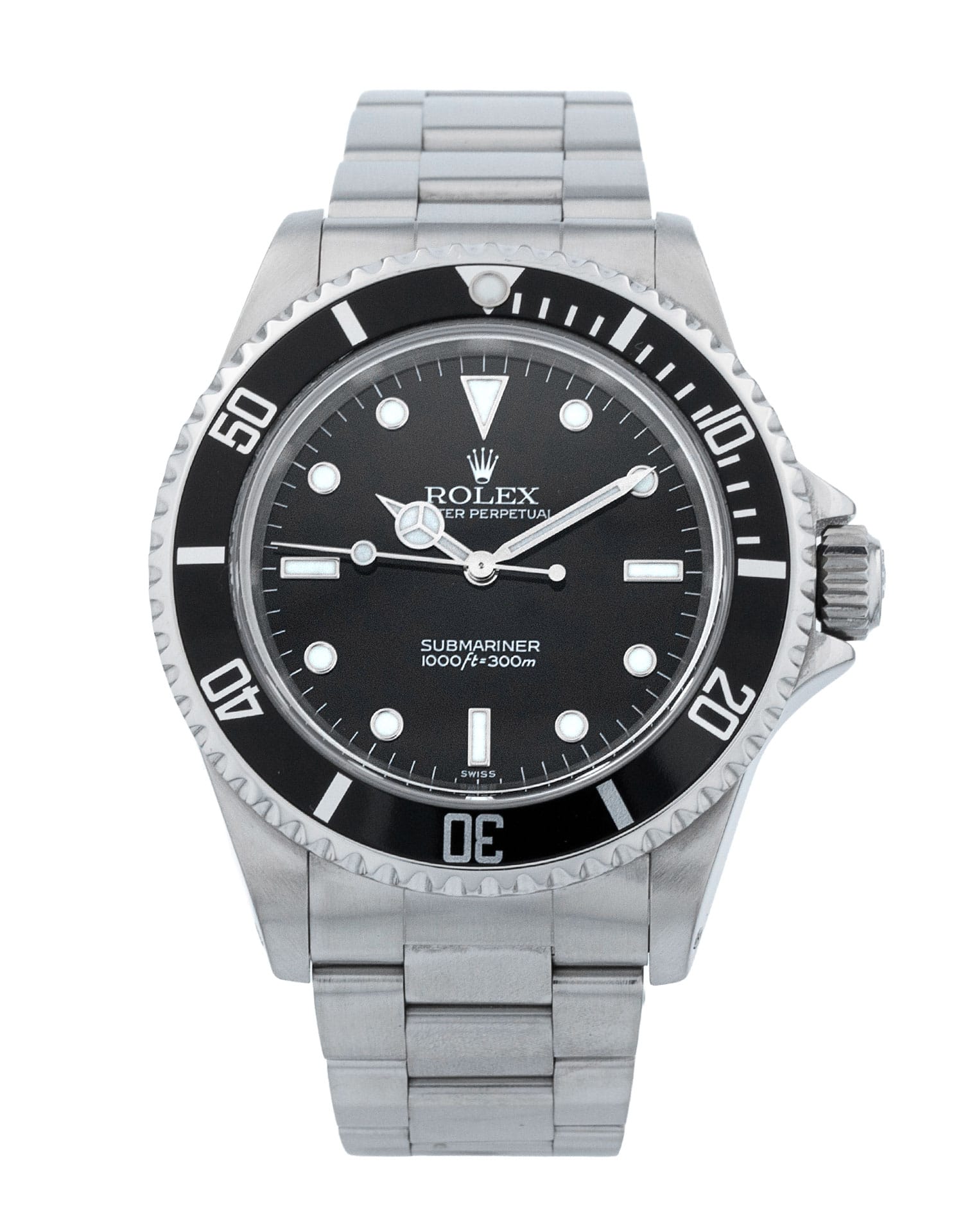 This Rolex Submariner 14060 has a black dial and a bracelet strap. This Rolex has undergone a thorough inspection of water resistance, accuracy, functionality and condition to determine the level of reconditioning required to meet our strict standards. It has also been referenced against technical documents and manufacturer records where available to ensure authenticity and a clean history. Our watches have a 24-month warranty for your peace of mind, in conjunction with any remaining manufacturer’s warranty from new or from service. To maintain the manufacturer’s warranty on this watch, it has not been polished in our service centre.