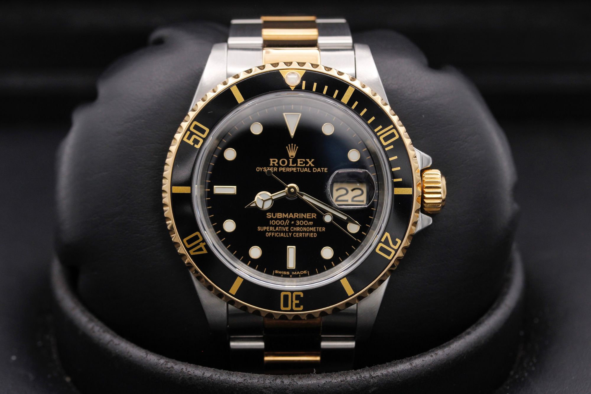 This Rolex Submariner 16613 has a black dial and a bracelet strap. This Rolex has undergone a thorough inspection of water resistance, accuracy, functionality and condition to determine the level of reconditioning required to meet our strict standards. It has also been referenced against technical documents and manufacturer records where available to ensure authenticity and a clean history. All our watches have a 24-month warranty for your peace of mind. One of our skilled polishing technicians has removed marks on the case and bracelet of this watch, brought about by daily wear and tear, which is why this watch does not come with the remaining manufacturer’s warranty.