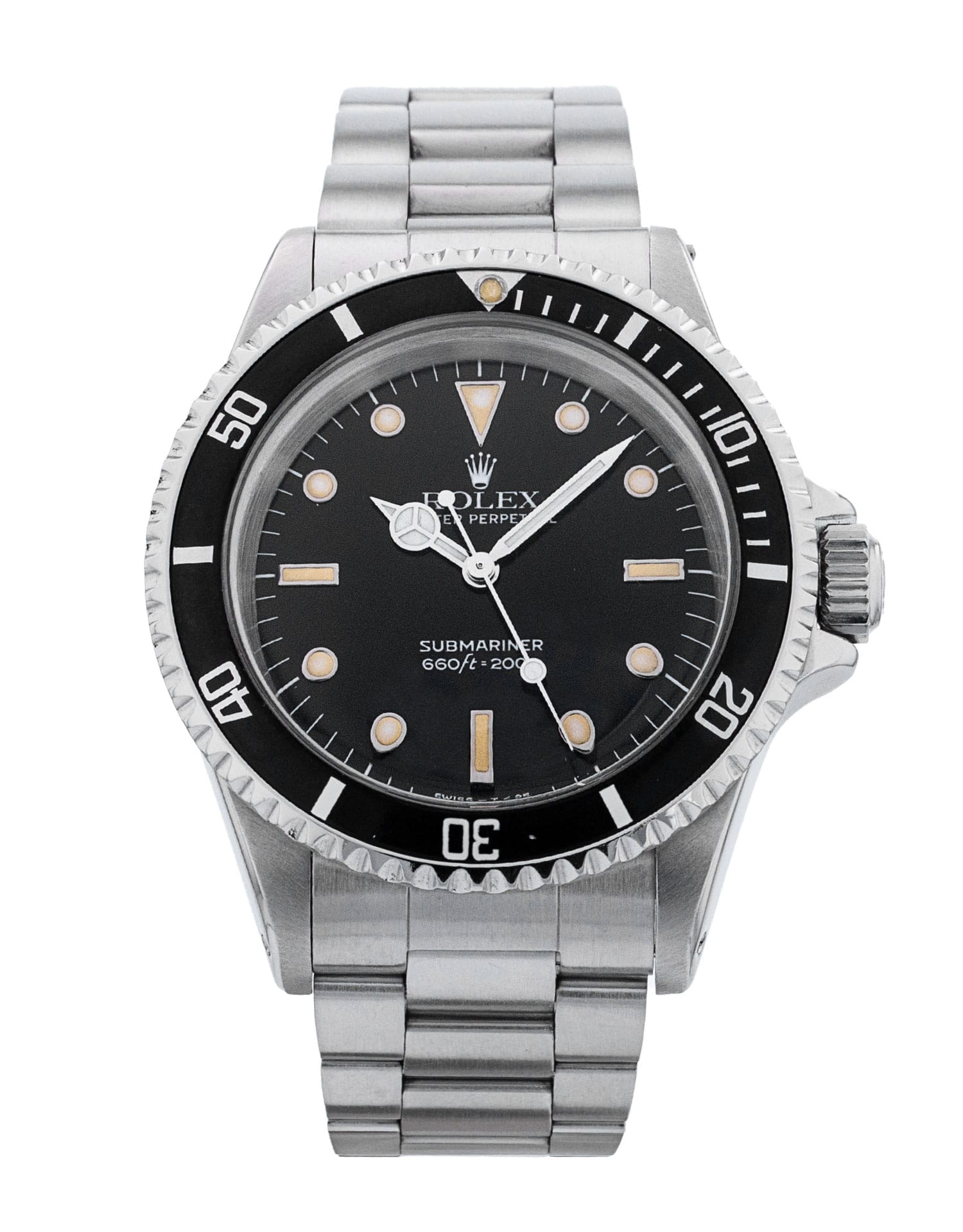 This Rolex Submariner 5513 has a black dial and a bracelet strap. This Rolex has undergone a thorough inspection of accuracy, functionality and condition to determine the level of reconditioning required to meet our strict standards. It has also been referenced against technical documents and manufacturer records where available to ensure authenticity and a clean history. All our watches have a 24-month warranty for your peace of mind. One of our skilled polishing technicians has removed marks on the case and bracelet of this watch, brought about by daily wear and tear, which is why this watch does not come with the remaining manufacturer’s warranty.
