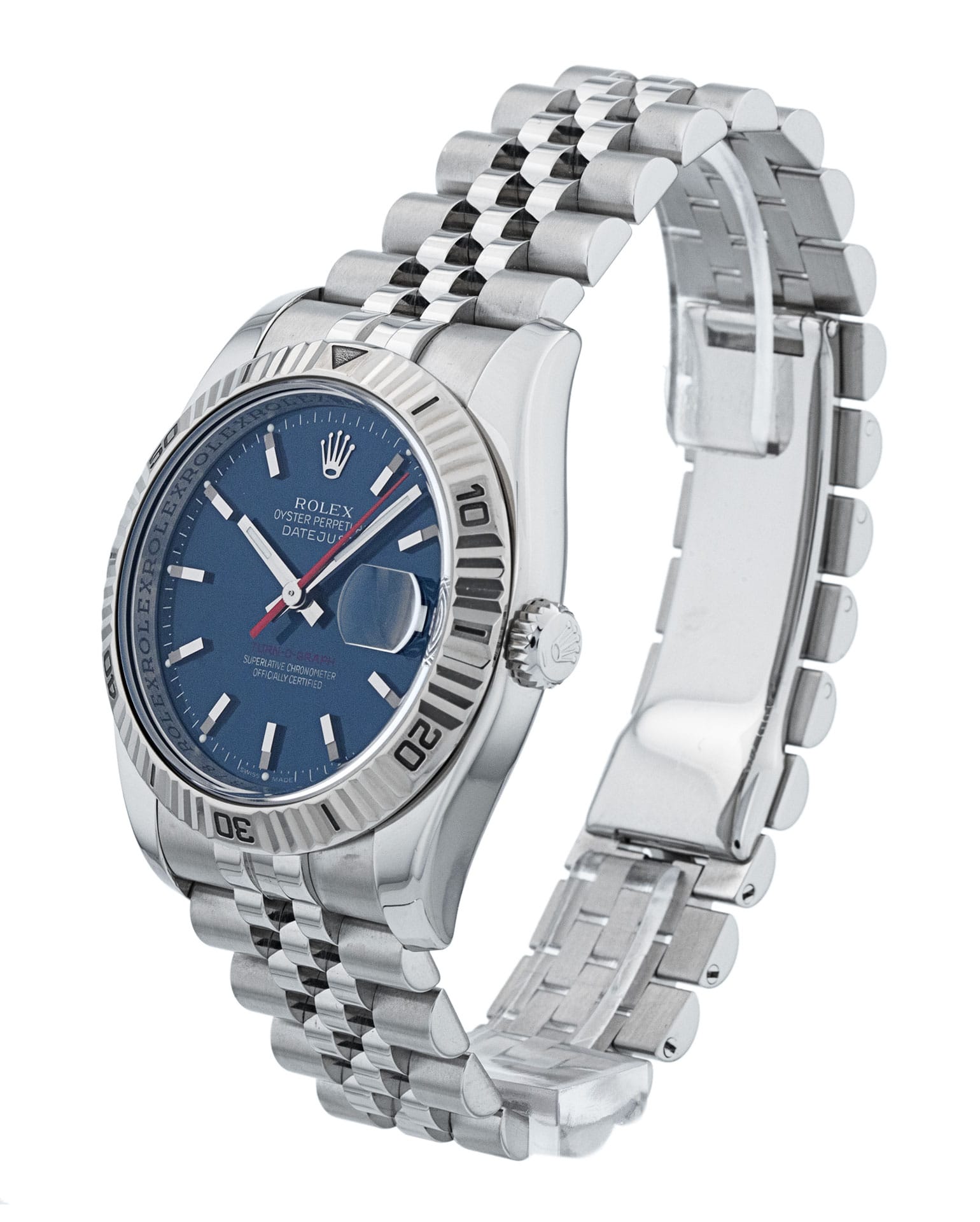 This Rolex Turn-O-Graph 116264 has a blue baton dial and a bracelet strap. This Rolex has undergone a thorough inspection of water resistance, accuracy, functionality and condition to determine the level of reconditioning required to meet our strict standards. It has also been referenced against technical documents and manufacturer records where available to ensure authenticity and a clean history. All our watches have a 24-month warranty for your peace of mind. One of our skilled polishing technicians has removed marks on the case and bracelet of this watch, brought about by daily wear and tear, which is why this watch does not come with the remaining manufacturer’s warranty.
