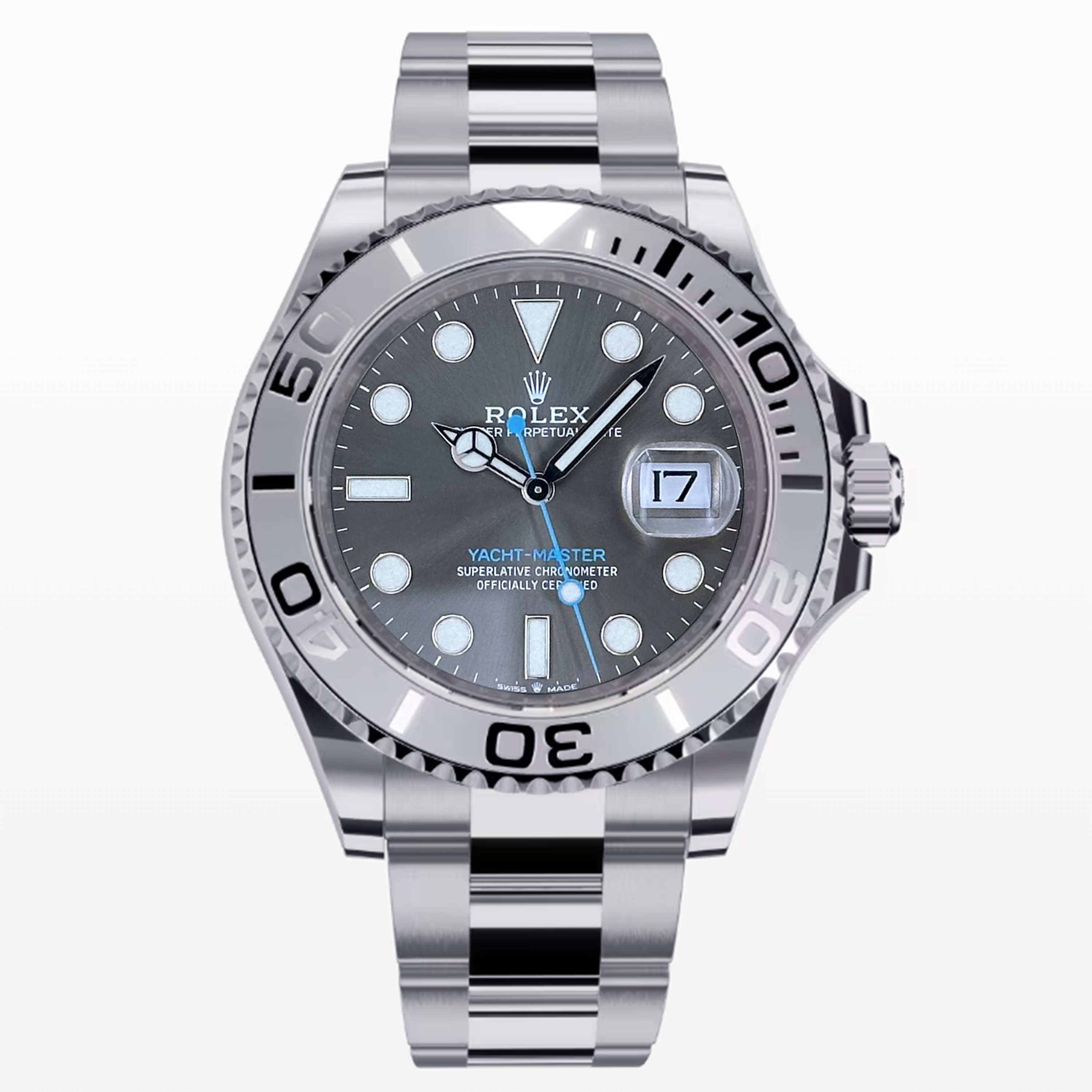 This Rolex Yacht-Master 126622 has a slate dial and a bracelet strap. This Rolex has undergone a thorough inspection of water resistance, accuracy, functionality and condition to determine the level of reconditioning required to meet our strict standards. It has also been referenced against technical documents and manufacturer records where available to ensure authenticity and a clean history. Our watches have a 24-month warranty for your peace of mind, in conjunction with any remaining manufacturer’s warranty from new or from service. To maintain the manufacturer’s warranty on this watch, it has not been polished in our service centre.