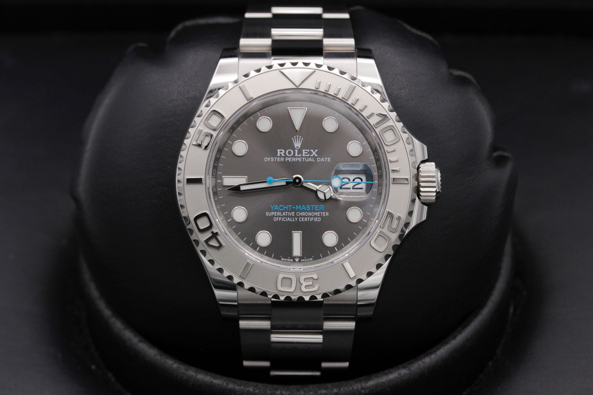 This Rolex Yacht-Master 126622 has a slate dial and a bracelet strap. This Rolex has undergone a thorough inspection of water resistance, accuracy, functionality and condition to determine the level of reconditioning required to meet our strict standards. It has also been referenced against technical documents and manufacturer records where available to ensure authenticity and a clean history. Our watches have a 24-month warranty for your peace of mind, in conjunction with any remaining manufacturer’s warranty from new or from service. To maintain the manufacturer’s warranty on this watch, it has not been polished in our service centre.
