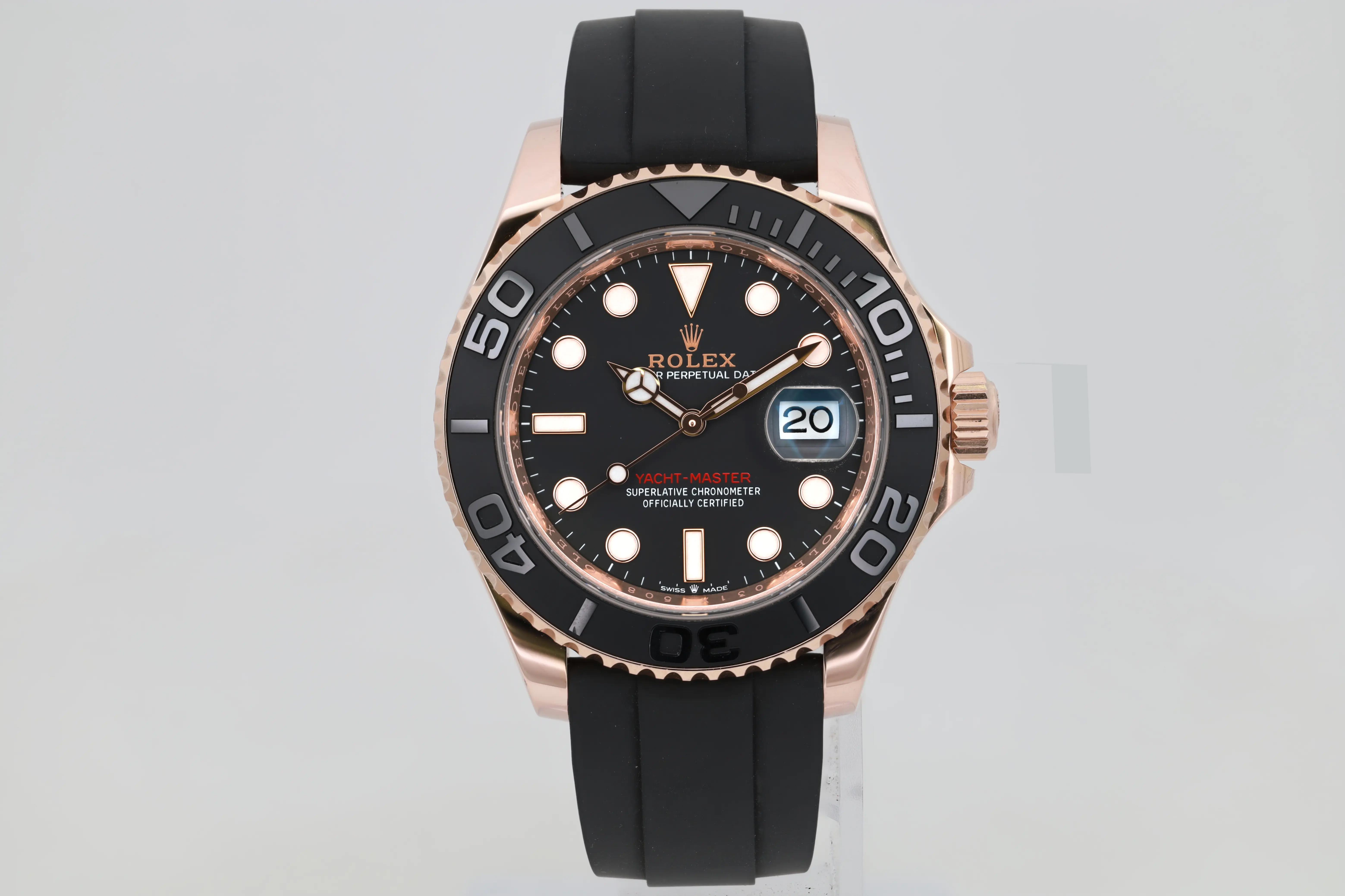 This Rolex Yacht-Master 126655 has a black dial and a rubber strap. This Rolex has undergone a thorough inspection of water resistance, accuracy, functionality and condition to determine the level of reconditioning required to meet our strict standards. It has also been referenced against technical documents and manufacturer records where available to ensure authenticity and a clean history. Our watches have a 24-month warranty for your peace of mind, in conjunction with any remaining manufacturer’s warranty from new or from service. To maintain the manufacturer’s warranty on this watch, it has not been polished in our service centre.