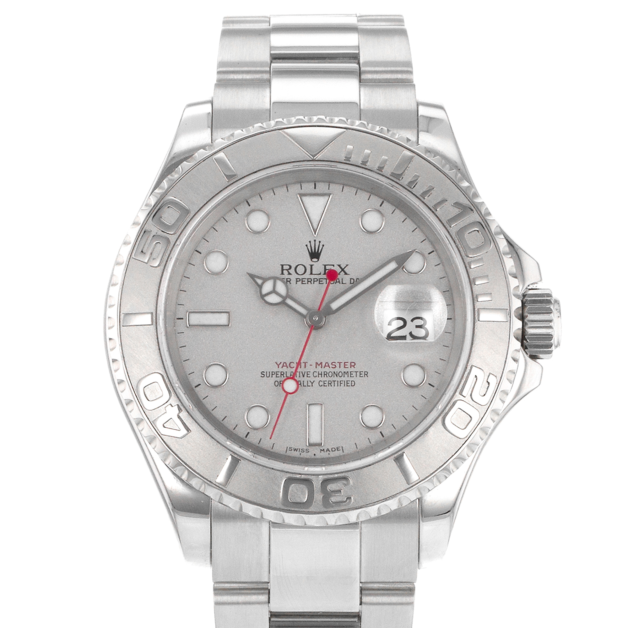 This Rolex Yacht-Master 16622 has a platinum dial and a bracelet strap. This Rolex has undergone a thorough inspection of water resistance, accuracy, functionality and condition to determine the level of reconditioning required to meet our strict standards. It has also been referenced against technical documents and manufacturer records where available to ensure authenticity and a clean history. All our watches have a 24-month warranty for your peace of mind. One of our skilled polishing technicians has removed marks on the case and bracelet of this watch, brought about by daily wear and tear, which is why this watch does not come with the remaining manufacturer’s warranty.