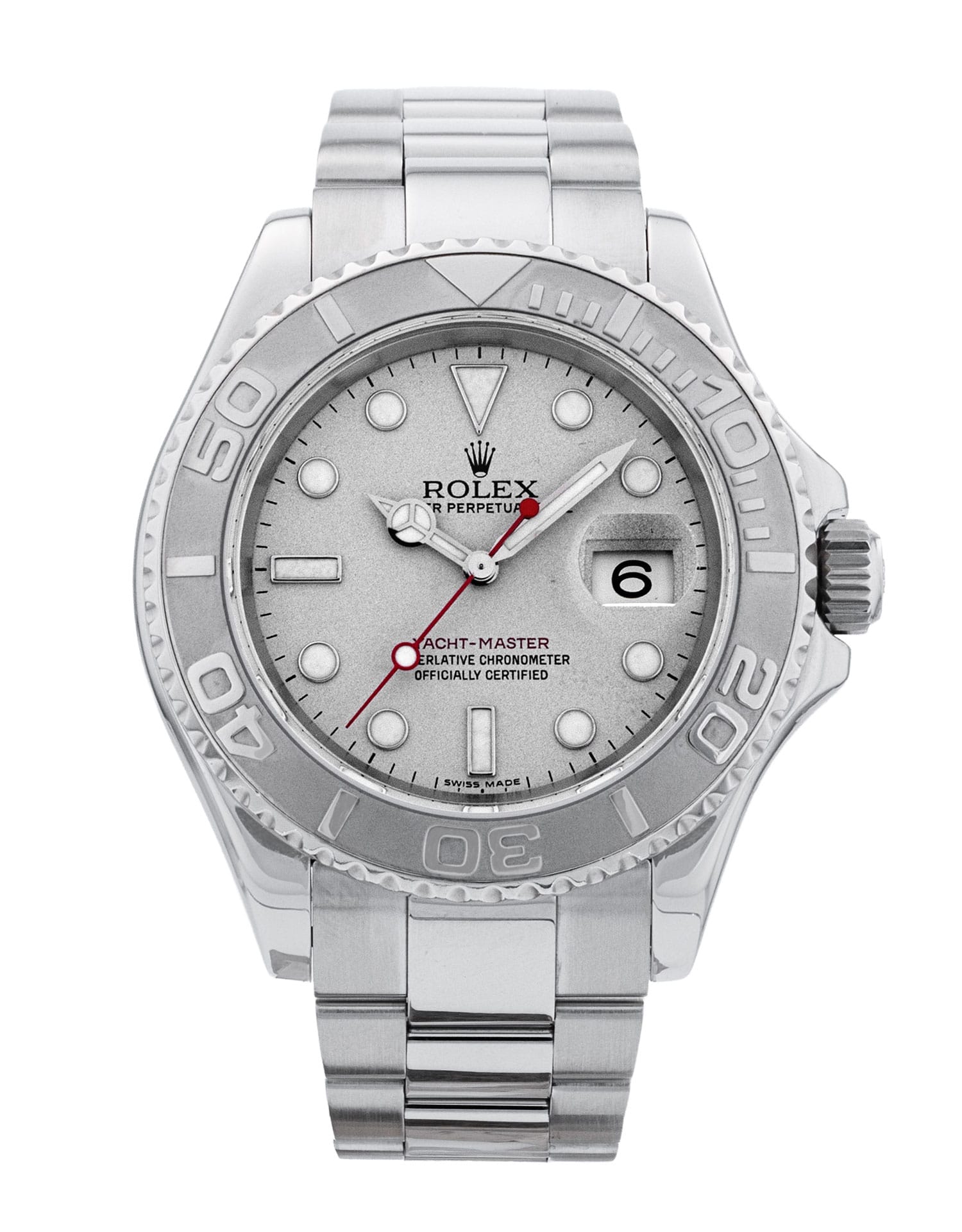 This Rolex Yacht-Master 16622 has a platinum dial and a bracelet strap. This Rolex has undergone a thorough inspection of water resistance, accuracy, functionality and condition to determine the level of reconditioning required to meet our strict standards. It has also been referenced against technical documents and manufacturer records where available to ensure authenticity and a clean history. All our watches have a 24-month warranty for your peace of mind. One of our skilled polishing technicians has removed marks on the case and bracelet of this watch, brought about by daily wear and tear, which is why this watch does not come with the remaining manufacturer’s warranty.