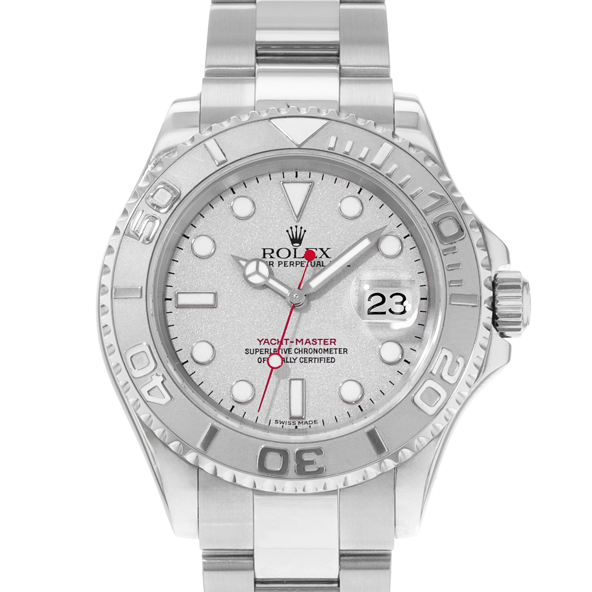 This Rolex Yacht-Master 16622 has a platinum dial and a bracelet strap. This Rolex has undergone a thorough inspection of water resistance, accuracy, functionality and condition to determine the level of reconditioning required to meet our strict standards. It has also been referenced against technical documents and manufacturer records where available to ensure authenticity and a clean history. All our watches have a 24-month warranty for your peace of mind. One of our skilled polishing technicians has removed marks on the case and bracelet of this watch, brought about by daily wear and tear, which is why this watch does not come with the remaining manufacturer’s warranty.