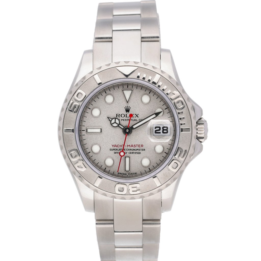 This Rolex Yacht-Master 169622 has a platinum dial and a bracelet strap. This Rolex has undergone a thorough inspection of water resistance, accuracy, functionality and condition to determine the level of reconditioning required to meet our strict standards. It has also been referenced against technical documents and manufacturer records where available to ensure authenticity and a clean history. All our watches have a 24-month warranty for your peace of mind. One of our skilled polishing technicians has removed marks on the case and bracelet of this watch, brought about by daily wear and tear, which is why this watch does not come with the remaining manufacturer’s warranty.