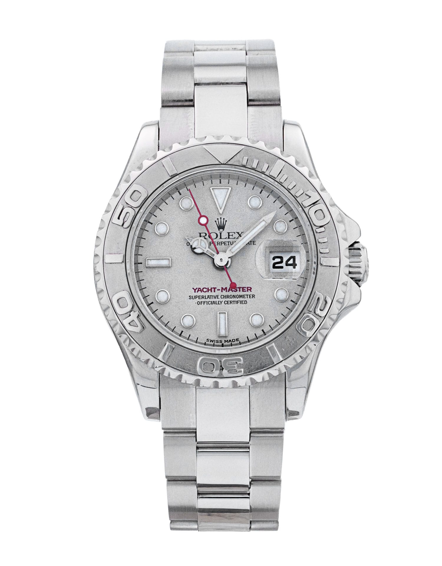 This Rolex Yacht-Master 169622 has a platinum dial and a bracelet strap. This Rolex has undergone a thorough inspection of water resistance, accuracy, functionality and condition to determine the level of reconditioning required to meet our strict standards. It has also been referenced against technical documents and manufacturer records where available to ensure authenticity and a clean history. All our watches have a 24-month warranty for your peace of mind. One of our skilled polishing technicians has removed marks on the case and bracelet of this watch, brought about by daily wear and tear, which is why this watch does not come with the remaining manufacturer’s warranty.