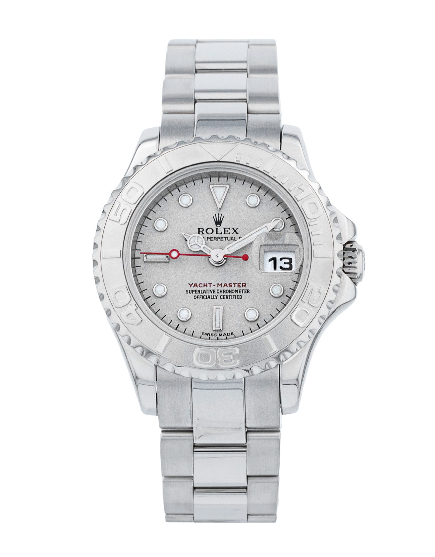 This Rolex Yacht-Master 169622 has a platinum dial and a bracelet strap. This Rolex has undergone a thorough inspection of water resistance, accuracy, functionality and condition to determine the level of reconditioning required to meet our strict standards. It has also been referenced against technical documents and manufacturer records where available to ensure authenticity and a clean history. All our watches have a 24-month warranty for your peace of mind. One of our skilled polishing technicians has removed marks on the case and bracelet of this watch, brought about by daily wear and tear, which is why this watch does not come with the remaining manufacturer’s warranty.