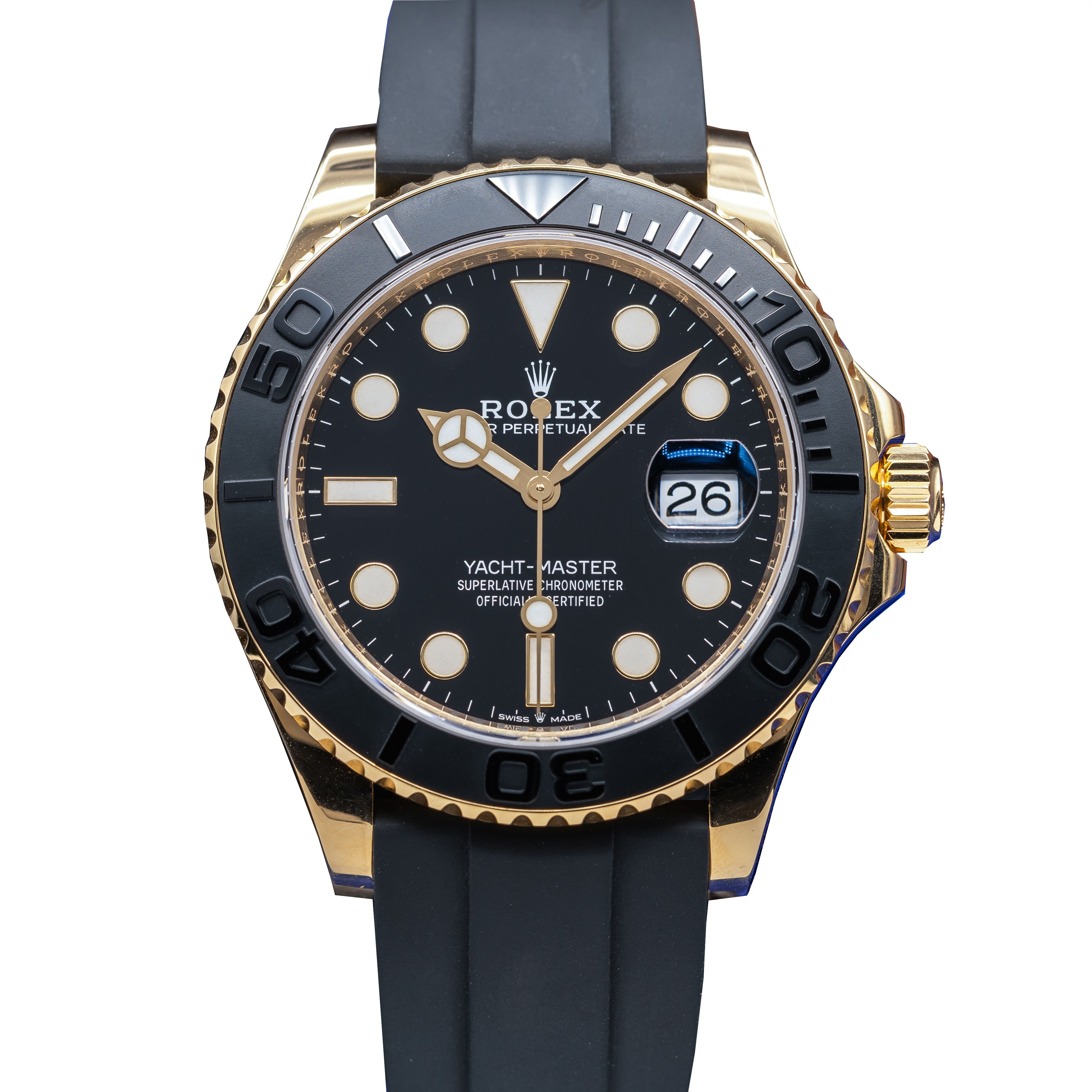 This Rolex Yacht-Master 226658 has a black dial and a rubber strap. This Rolex has undergone a thorough inspection of water resistance, accuracy, functionality and condition to determine the level of reconditioning required to meet our strict standards. It has also been referenced against technical documents and manufacturer records where available to ensure authenticity and a clean history. Our watches have a 24-month warranty for your peace of mind, in conjunction with any remaining manufacturer’s warranty from new or from service. To maintain the manufacturer’s warranty on this watch, it has not been polished in our service centre.