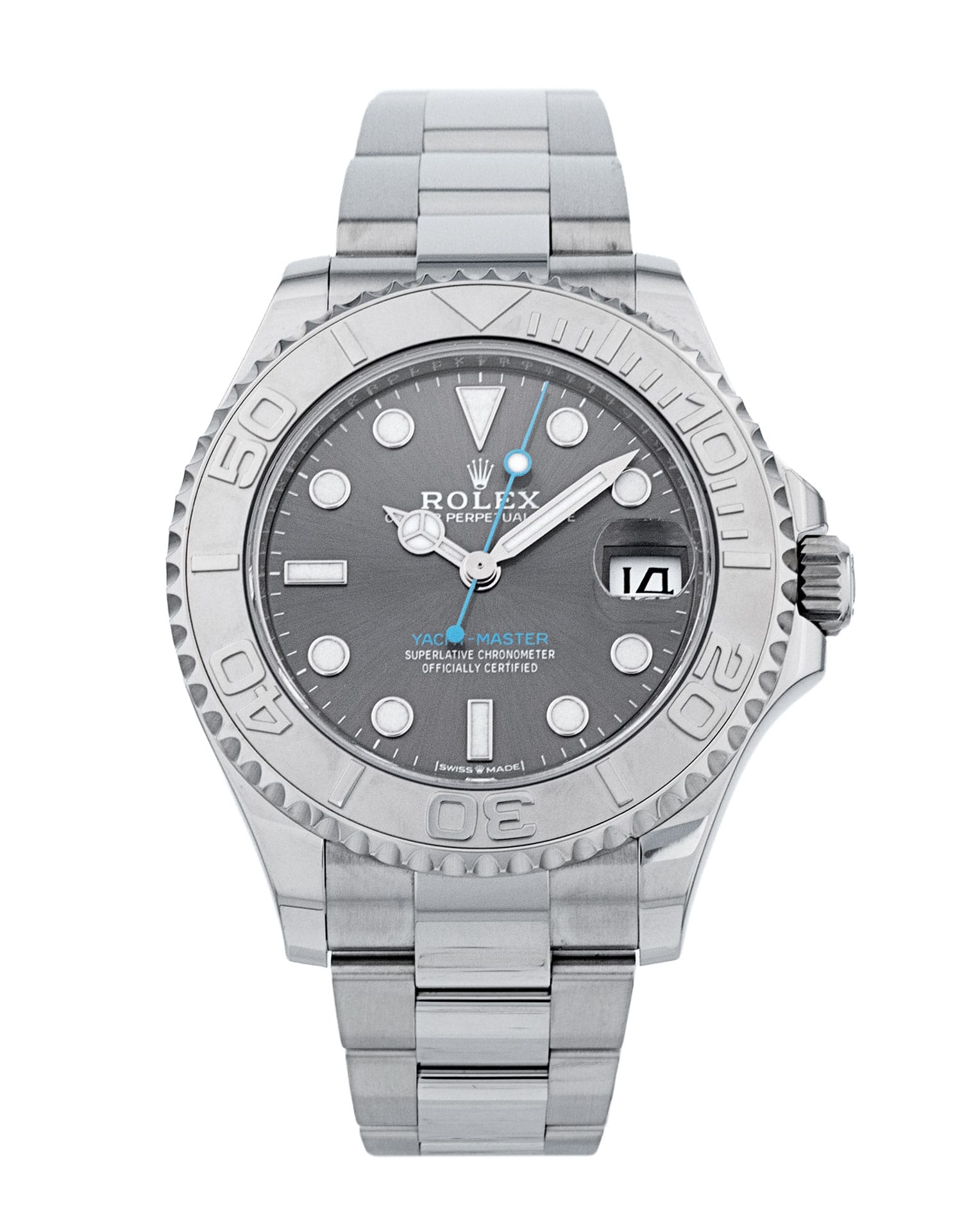 This Rolex Yacht-Master 268622 has a slate dial and a bracelet strap. This Rolex has undergone a thorough inspection of water resistance, accuracy, functionality and condition to determine the level of reconditioning required to meet our strict standards. It has also been referenced against technical documents and manufacturer records where available to ensure authenticity and a clean history. Our watches have a 24-month warranty for your peace of mind, in conjunction with any remaining manufacturer’s warranty from new or from service. To maintain the manufacturer’s warranty on this watch, it has not been polished in our service centre.