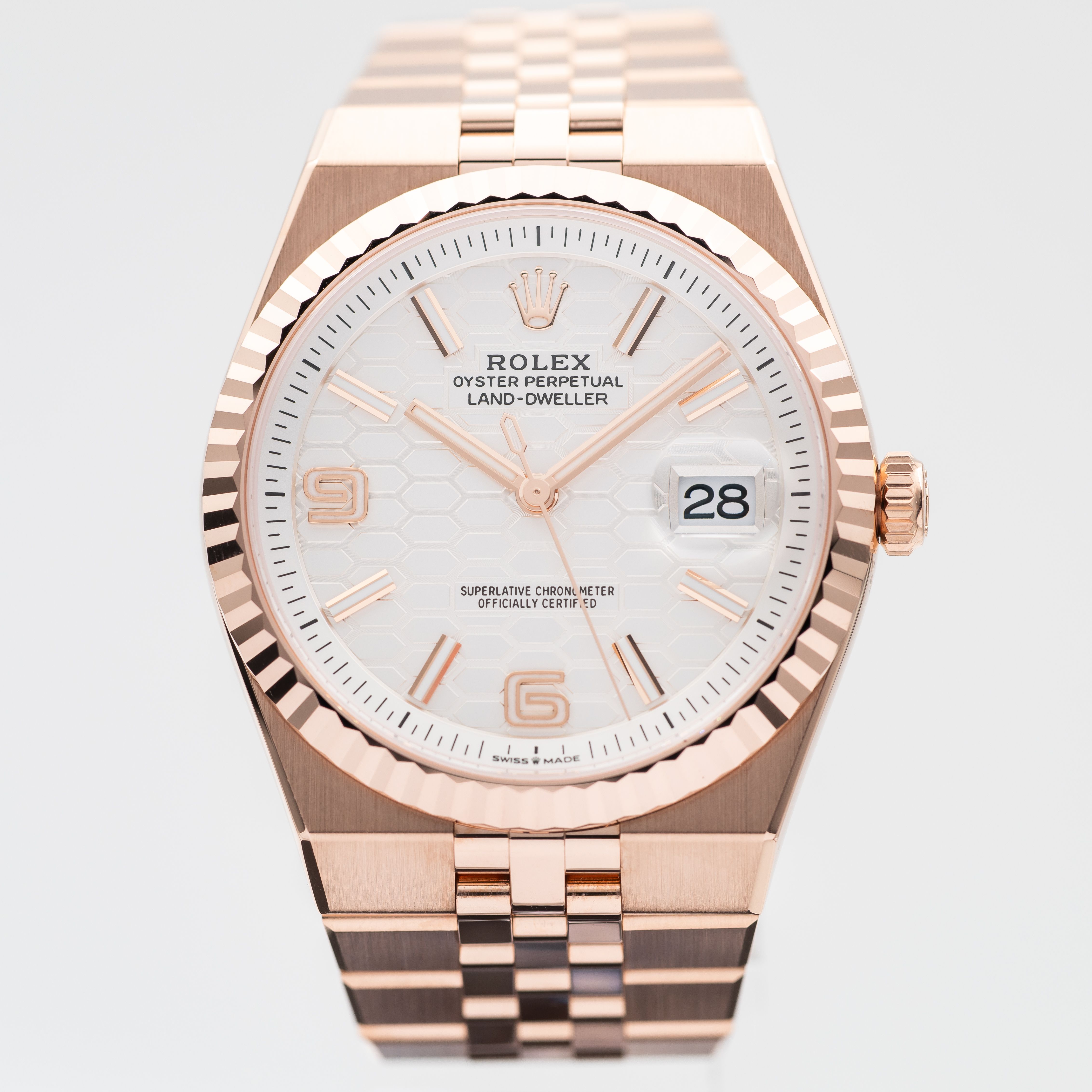 This Rolex Land-Dweller 40 127335 has a white honeycomb dial and a bracelet strap. This Rolex has undergone a thorough inspection of water resistance, accuracy, functionality and condition to determine the level of reconditioning required to meet our strict standards. It has also been referenced against technical documents and manufacturer records where available to ensure authenticity and a clean history. Our watches have a 24-month warranty for your peace of mind, in conjunction with any remaining manufacturer’s warranty from new or from service. To maintain the manufacturer’s warranty on this watch, it has not been polished in our service centre.