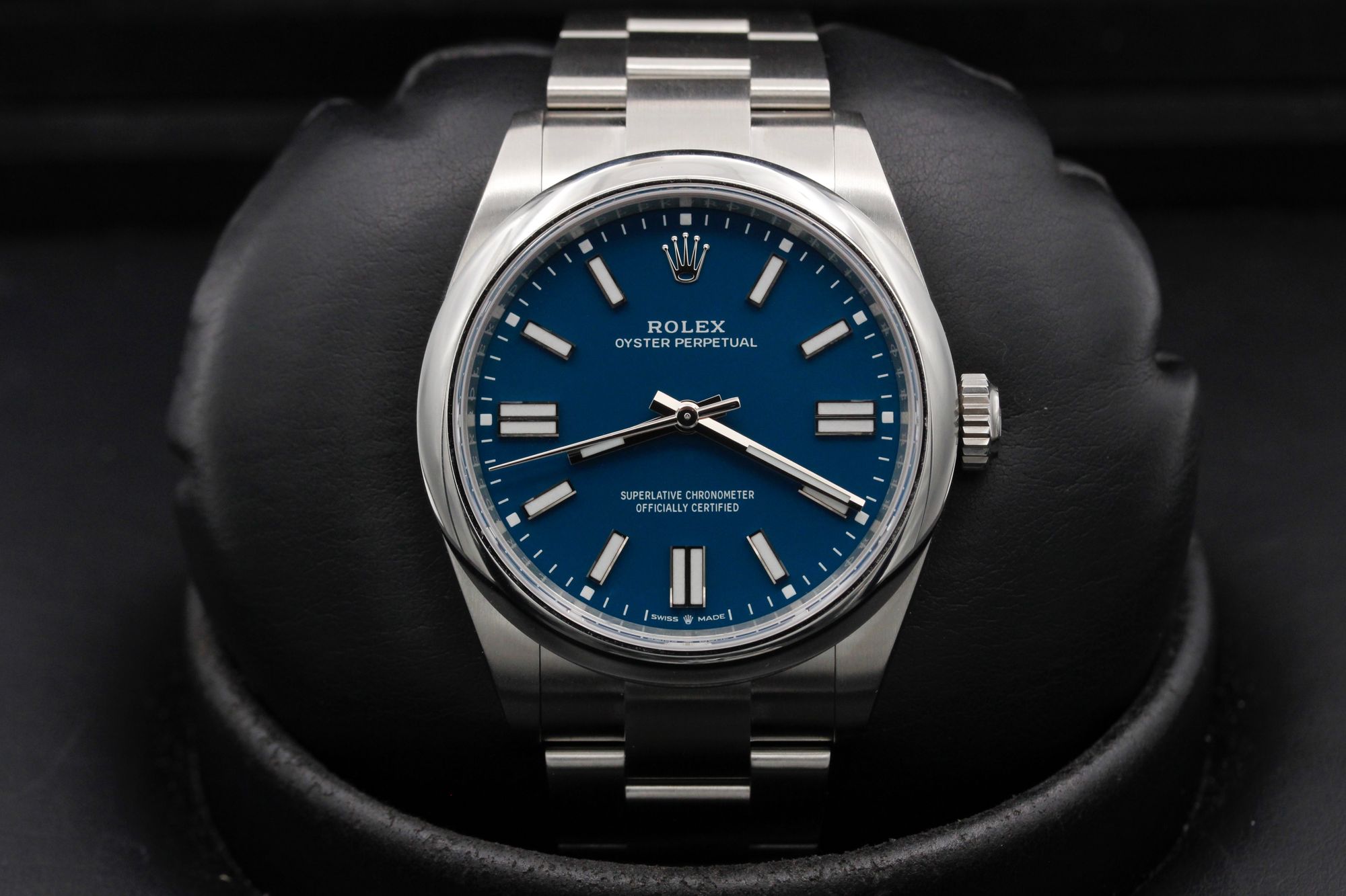 This Rolex Oyster Perpetual 41 134300 has a blue dial and a bracelet strap. This Rolex has undergone a thorough inspection of water resistance, accuracy, functionality and condition to determine the level of reconditioning required to meet our strict standards. It has also been referenced against technical documents and manufacturer records where available to ensure authenticity and a clean history. Our watches have a 24-month warranty for your peace of mind, in conjunction with any remaining manufacturer’s warranty from new or from service. To maintain the manufacturer’s warranty on this watch, it has not been polished in our service centre.